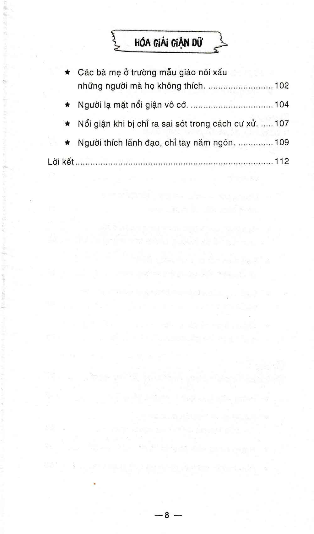 - Những phiền phức trong cuộc sống thường nhật Mỗi ngày một người bình thường dường như phải đối mặt với rất nhiều những cơn giận dữ từ nhiều nguồn khác nhau. Rất may trong cuốn sách này, bác sĩ tâm lý Fujii Masako sẽ chỉ ra cho độc giả cách thức hóa giải những giận dữ mà bạn có thể phải đối mặt. Tác giả Fujii Masako cho biết có vô số lý do khiến một người trở nên giận dữ, tuy nhiên có một điểm chung duy nhất, đó là người tức giận đang gặp phải khó khăn, và chính vì không xử lý được vấn đề nên họ chỉ còn cách thể hiện bằng sự tức giận. Do đó, từ nay nếu gặp ai đó đang giận dữ, bạn hãy tự nhủ rằng họ đang gặp khó khăn. “Tôi là tôi. Bạn là bạn”. Nếu chúng ta có thể phân biệt rạch ròi ranh giới giữa bản thân và người khác thì việc chúng ta bị cảm xúc của họ chi phối, hoặc trút giận lên người khác chắc chắn sẽ giảm đáng kể. Nếu vẫn quá để tâm đến chuyện đó thì tốt hơn hết, bạn hãy xem xem liệu mình có thể giúp họ điều gì không. Ẩn chứa phía sau cơn giận dữ là vô vàn các nguyên do, và đó chính là điều mà tác giả cuốn sách cung cấp cho độc giả trong cuốn sách này. Hy vọng rằng khi phải đối mặt với sự tức giận của ai đó, bạn có thể đối phó một cách khéo léo và hiệu quả .
