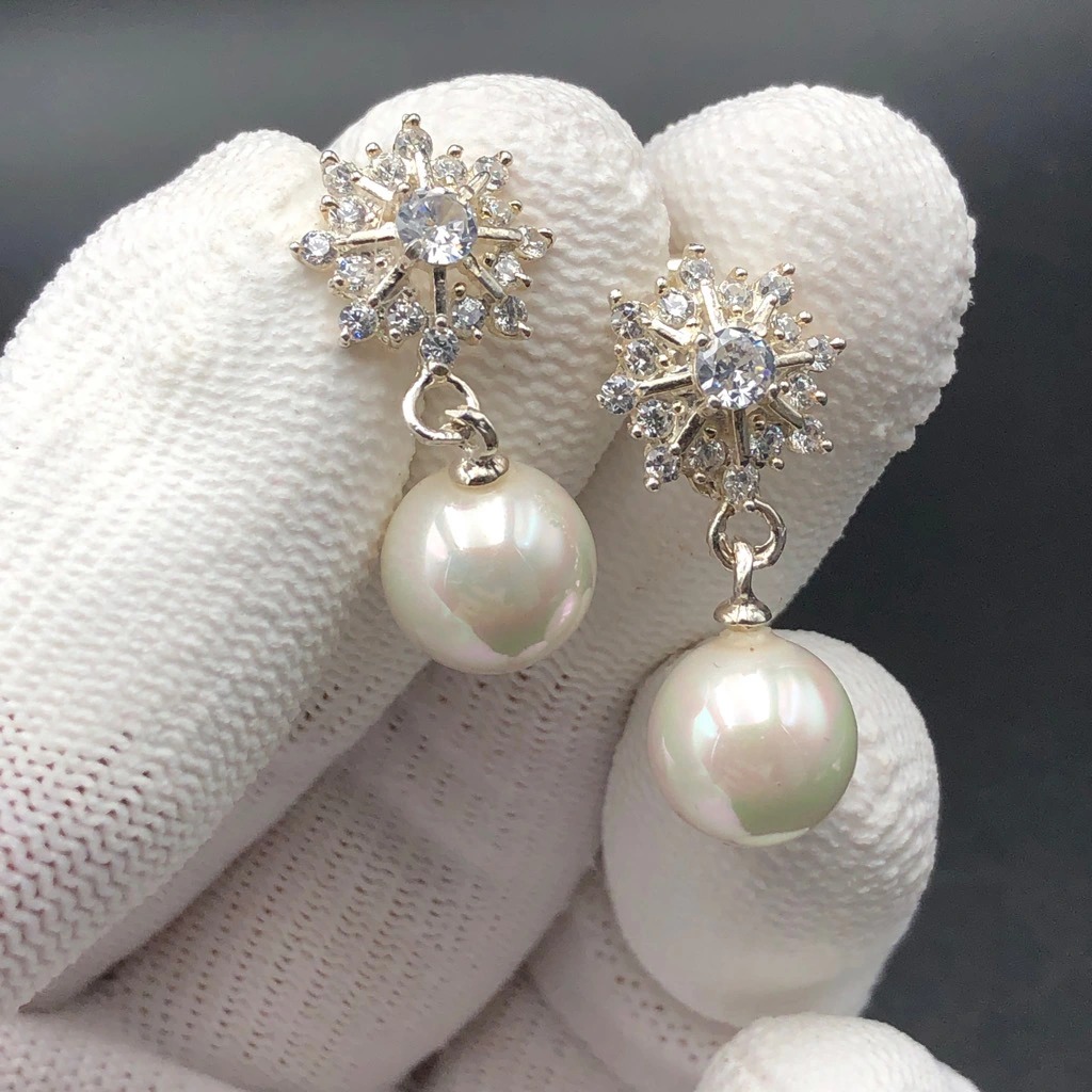 Đôi Bông Tai Bông Ngọc Trai xanh dương nhẹ bóng đẹp 9mm Size hạt 9mm ngọc trai cao cấp thiên nhiên mệnh Thủy Mộc Nữ về bọc Vàng làm đôi bông tai vàng đeo