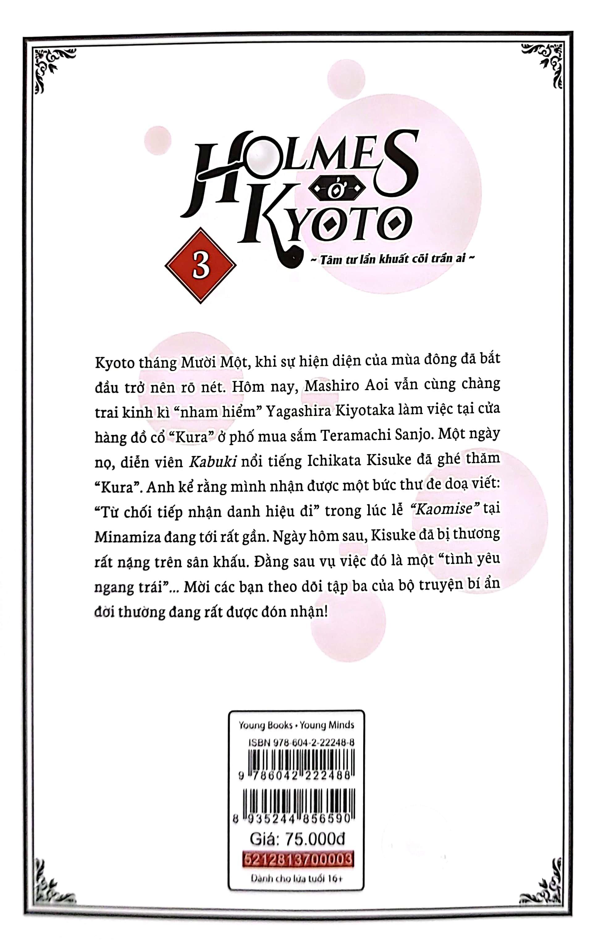 Mua tại TiktokKyoto tháng Mười Một, khi sự hiện diện của mùa đông đã bắt đầu trở nên rõ nét. Hôm nay, Mashiro Aoi vẫn cùng chàng trai kinh kì “nham hiểm” Yagashira Kiyotaka làm việc tại cửa hàng đồ cổ “Kura” ở phố mua sắm Teramachi Sanjo. Một ngày nọ, diễn viên Kabuki nổi tiếng Ichikata Kisuke đã ghé thăm “Kura”. Anh kể rằng mình nhận được một bức thư đe doạ viết: “Từ chối tiếp nhận danh hiệu đi” trong lúc lễ “Kaomise” tại Minamiza đang tới rất gần. Ngày hôm sau, Kisuke đã bị thương rất nặng trên sân khấu. Đằng sau vụ việc đó là một “tình yêu ngang trái” Mời các bạn theo dõi tập ba của bộ truyện bí ẩn đời thường đang rất được đón nhận!