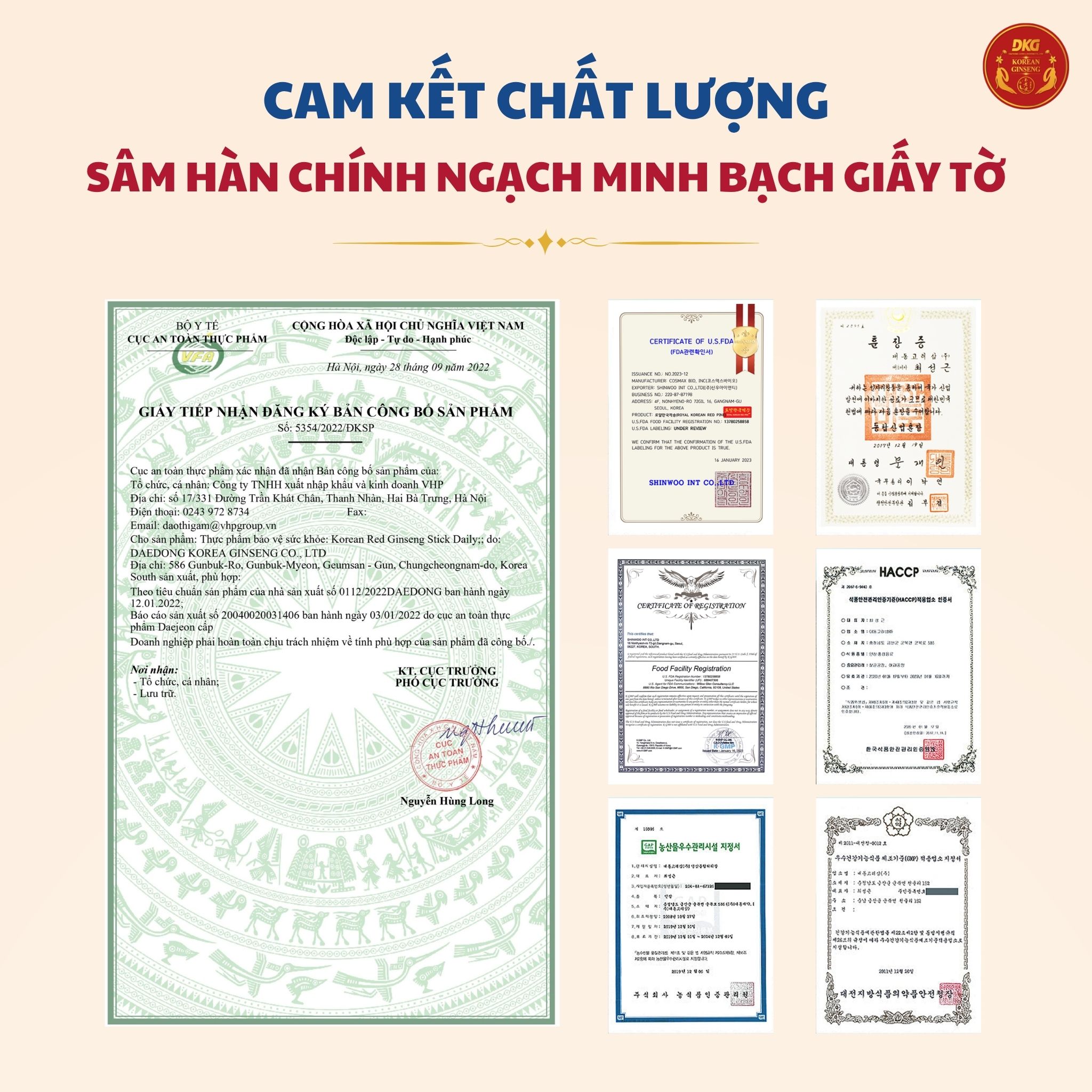 Thông tin về sản phẩm 1. Tên sản phẩm: KOREAN RED GINSENG BIRD’S NEST EXTRACT DKG: YẾN SÀO HỒNG SÂM DKG 2. Thành phần: Chiết xuất hồng sâm (hàm lượng chất rắn 50%, nội địa ), hương