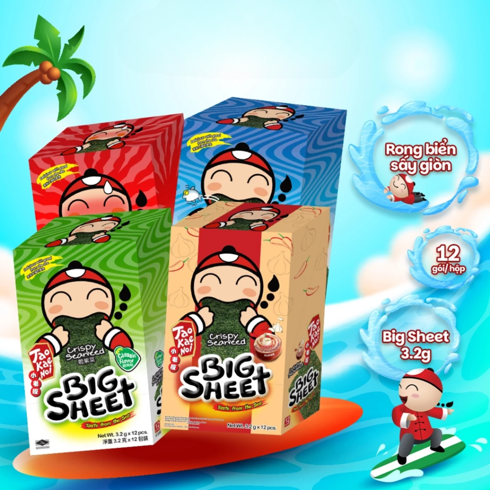 Mua tại TiktokSnack Rong Biển Taokaenoi BIG SHEET nhiều vị: truyền thống, cay, hải sản, sốt Mayo tỏi ớt mới (Hộp 12 gói) Snack rong biển sấy BIG SHEET với nhiều hương vị thơm ngon, kèm thêm độ giòn xốp, khiến người dùng cả người lớn và trẻ em sẽ không thể cưỡng lại được sức hấp dẫn của món snack rong biển này khi đã ăn thử. Sản phẩm được sản xuất quy trình sấy hiện đại, vừa đem lại độ giòn xốp vừa bảo toàn được hương vị và phần lớn chất dinh dưỡng có trong rong biển. Mỗi gói 1 lá rong biển to, tiện lợi mang theo đi học, đi chơi.