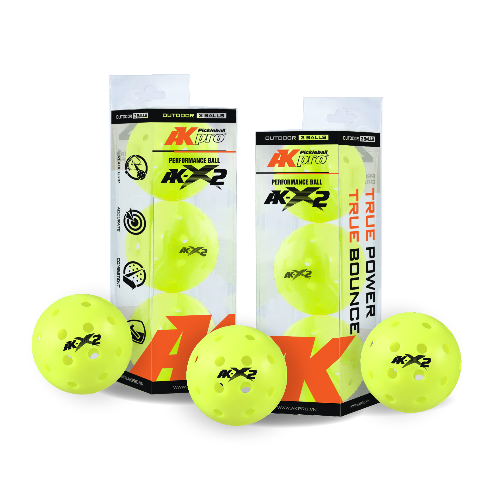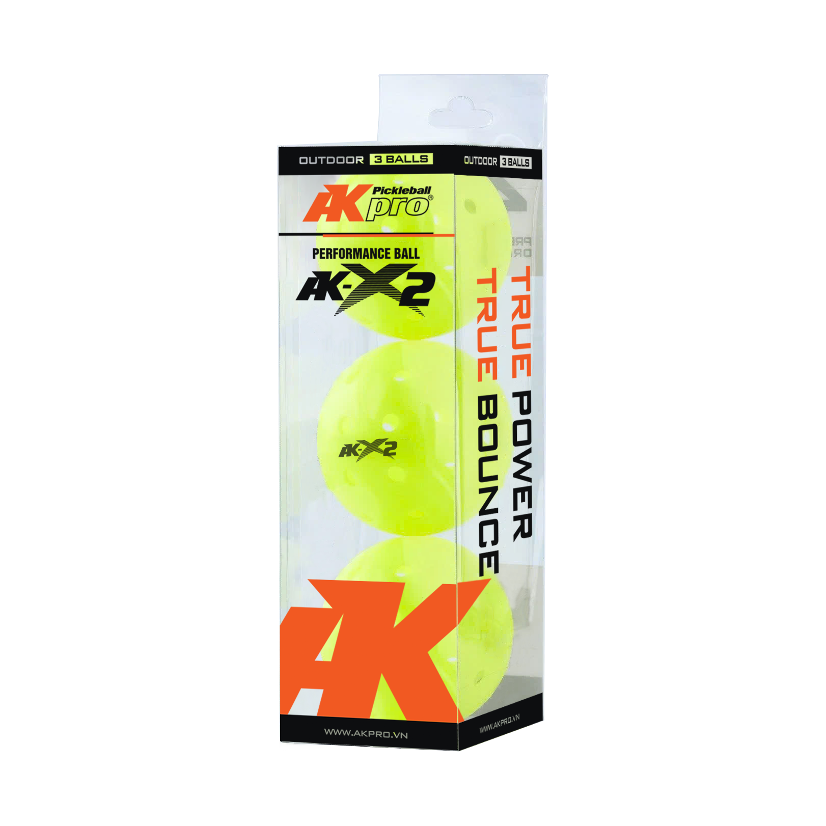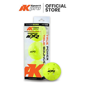Hộp 3 bóng Pickleball AK-X2 Sử dụng vật liệu PE cao cấp được đúc khuyên khối, 40 lỗ. Trọng lượng, kích thước và độ nảy tiêu chuẩn ngoài trời. Bóng có đường bay ổn định, bám mặt vợt và rất bền.