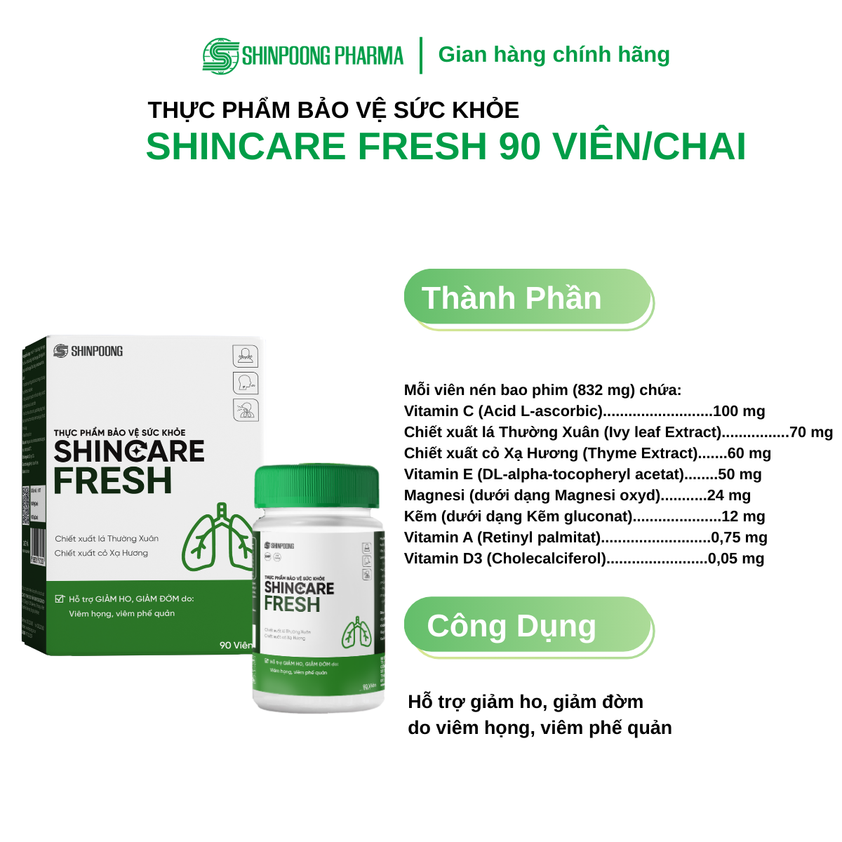THỰC PHẨM BẢO VỆ SỨC KHỎE: SHINCARE FRESH THÀNH PHẦN Mỗi viên nén bao phim (832 mg) chứa: Vitamin C (Acid L-ascorbic) .100 mg Chiết xuất lá Thường Xuân (Ivy leaf Extract) .70 mg Chiết