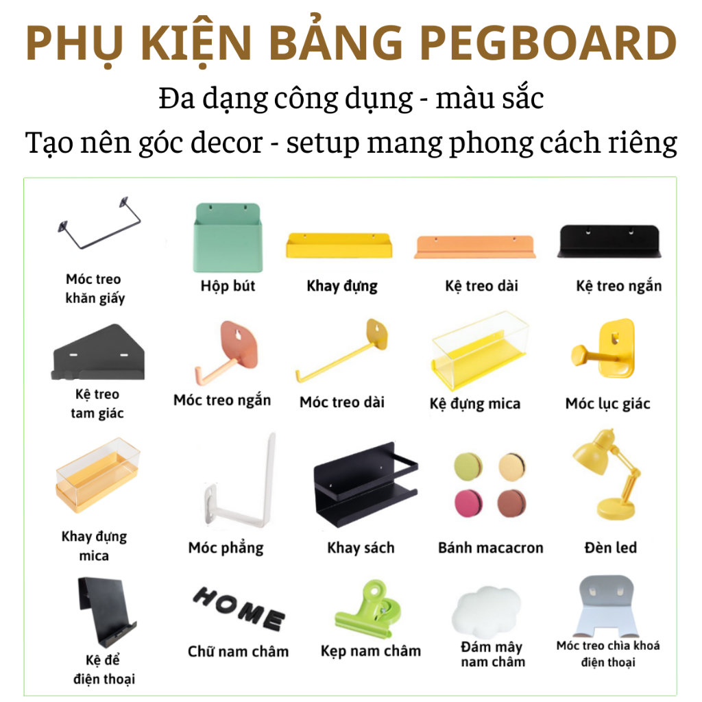 Hộp bút + khay đựng + kệ L ngắn + kệ L Dài + kệ tam giác Dola Home để vật dụng cần thiết - Phụ kiện bảng Pegboard Chi tiết sản phẩm : ++