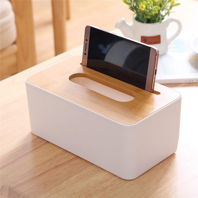Hộp đựng khăn giấy bằng nhựa chữ nhật nắp gỗ phù hợp sử dụng trong gia đình, khách sạn