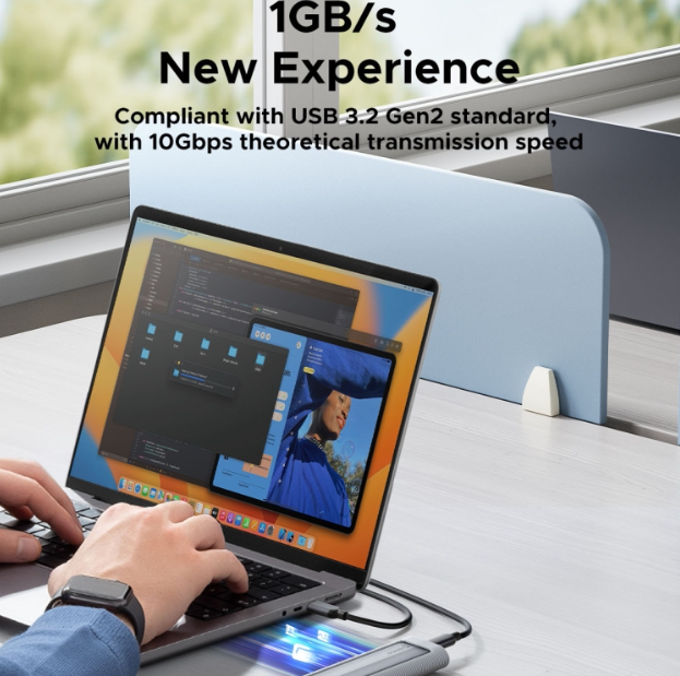 • Sử dụng chuẩn USB 3.2 Gen 2 Type-C, hộp ổ cứng SSD này cung cấp tốc độ truyền dữ liệu nhanh lên đến 10Gbps, giúp sao chép và truy xuất dữ liệu lớn chỉ trong vài giây.