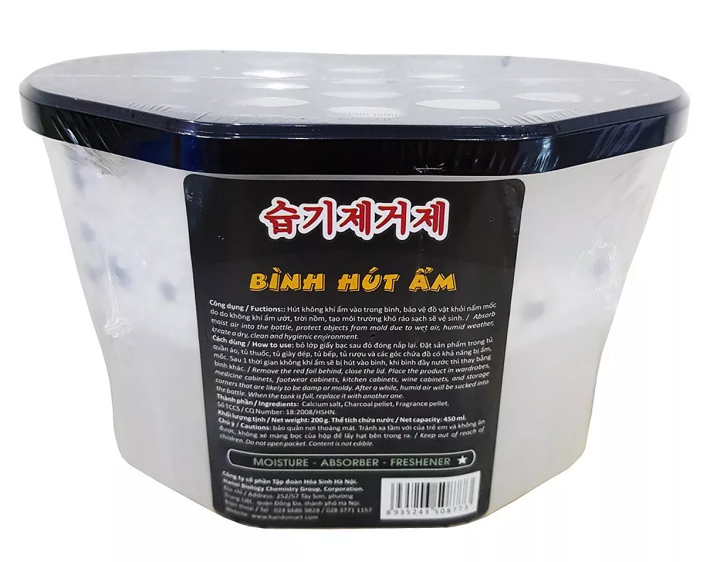 Tên sản phẩm : Bình hút ẩm chống ẩm mốc than hoạt tính Hando 450ml Công dụng : Sản phẩm có thể đặt trong tủ quần áo, tủ thuốc, tủ giày dép, tủ bếp và