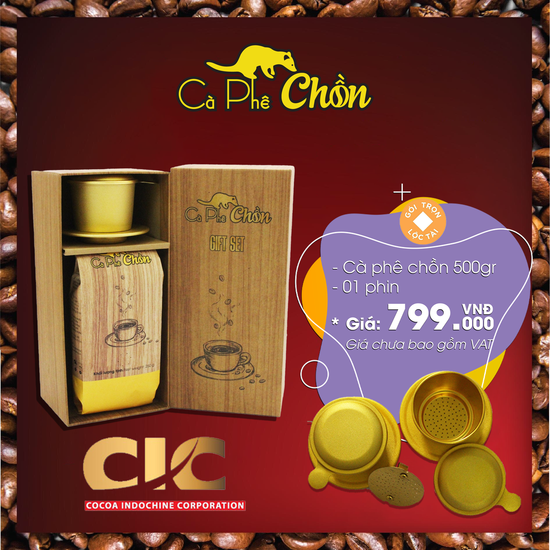 - Sản phẩm gồm:     + 1 túi cà phê chồn 500g     + 1 phin cà phê mạ màu công nghệ anod đẹp     + 1 hộp đựng bằng gỗ nhẹ.- Sản phẩm được sản xuất từ quy trình đạt tiêu chuẩn về an toàn thực phẩm.-...