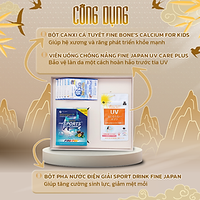 Combo FUJI TẾT BÌNH AN - Viên Uống Chống Nắng Fine Japan Uv Care Plus Hạn Chế Lão Hóa Da, Giúp Da Sáng Mịn 30 Viên - Bột Canxi Cá Tuyết Fine Bone's Calcium For Kids Gói 140G Bổ Sung Canxi Phát Triển Chiều Cao - Bột Pha Nước Điện Giải Sport Drink Fine Japan Hương Chanh Dây 5 Gói COMBO FUJI TẾT BÌNH AN phù hợp làm quà tặng cho phụ nữ trên 30 tuổi, người thường xuyên tiếp xúc với ánh nắng, cần bảo vệ cơ thể tránh mất nước khi hoạt động nhiều, người muốn, khỏe từ bên trong, tươi trẻ cho diện mạo bên ngoài.