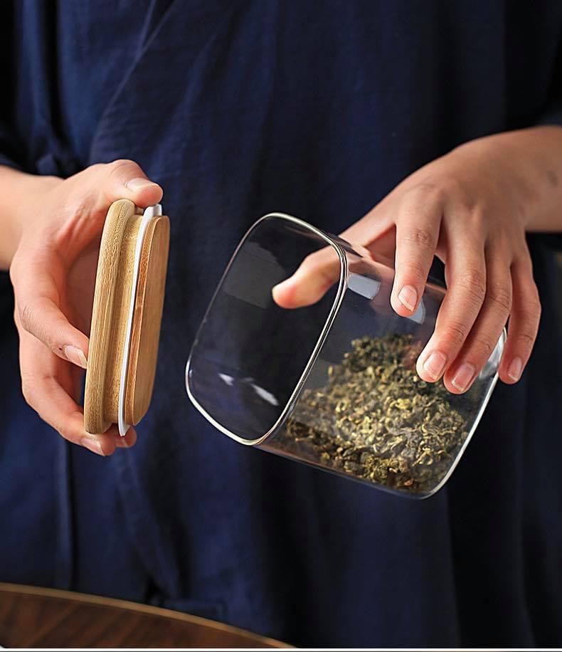 Hũ thuỷ tinh nắp gỗ dáng vuông độc đáo để đựng các loại hạt, đồ khô hay bánh kẹo, mì khô vừa đẹp, lại sạch sẽ, gọn gàng Hũ có nắp gỗ có gioăng silicone