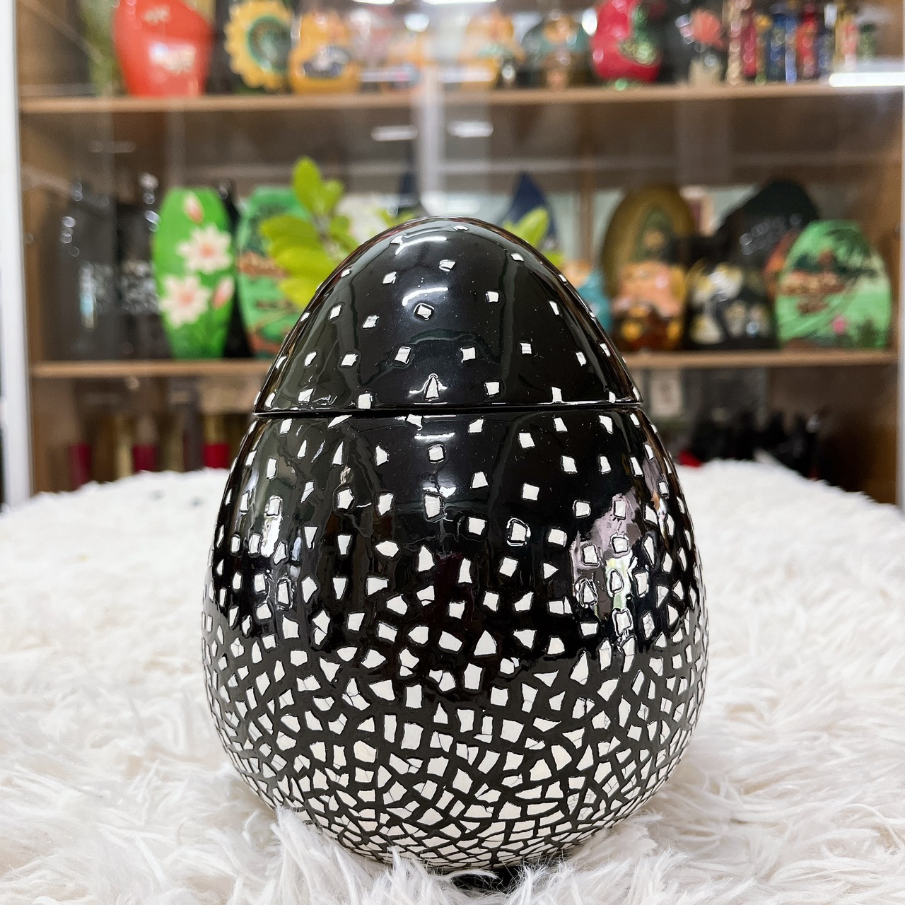 Sản phẩm được làm từ cốt gỗ nguyên cây, mẫu mã đa dạng phong phú, từ cẩn trứng đến vẽ tay tỉ mỉ, họa tiết hoa văn thanh lịch, nhiều màu sắc đa dạng, bên ngoài phủ nhiều lớp sơn để tạo độ sáng bóng.