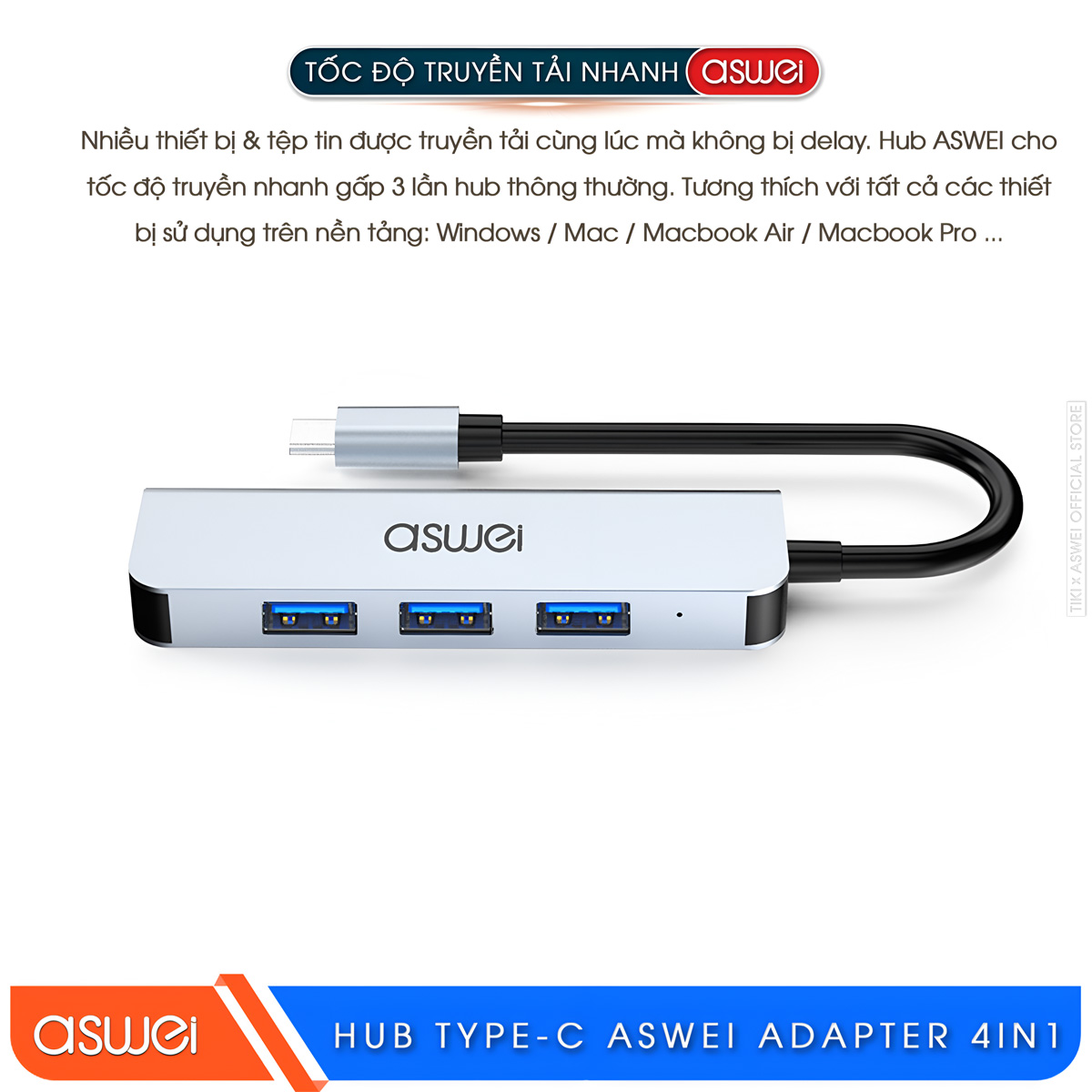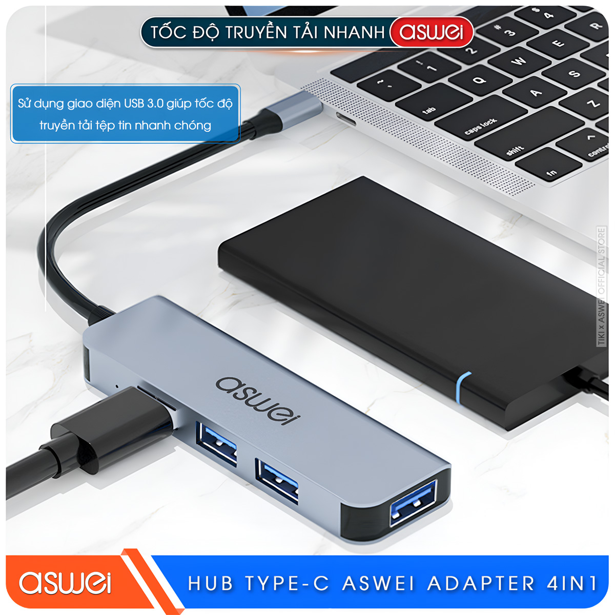 - Hub USB và Type-C ASWEI 4in1: Tốc độ truyền tải cao, không bị chậm trễ