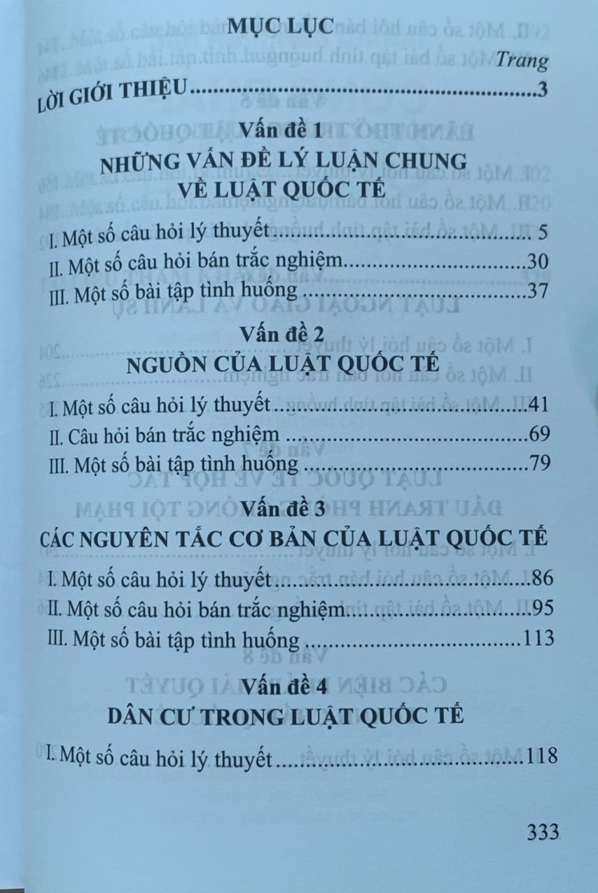 Cuốn sách được thiết kế rất sát với các vấn đề của các giáo trình công pháp quốc tế phổ biến hiện nay, qua đó sẽ giúp người học vừa tận dụng được nguồn tri thức quý báu từ các giáo trình, các bài tập giảng, vừa làm sâu sắc hơn kiến thức và những câu hỏi xoay quanh các vấn đề của các môn học."