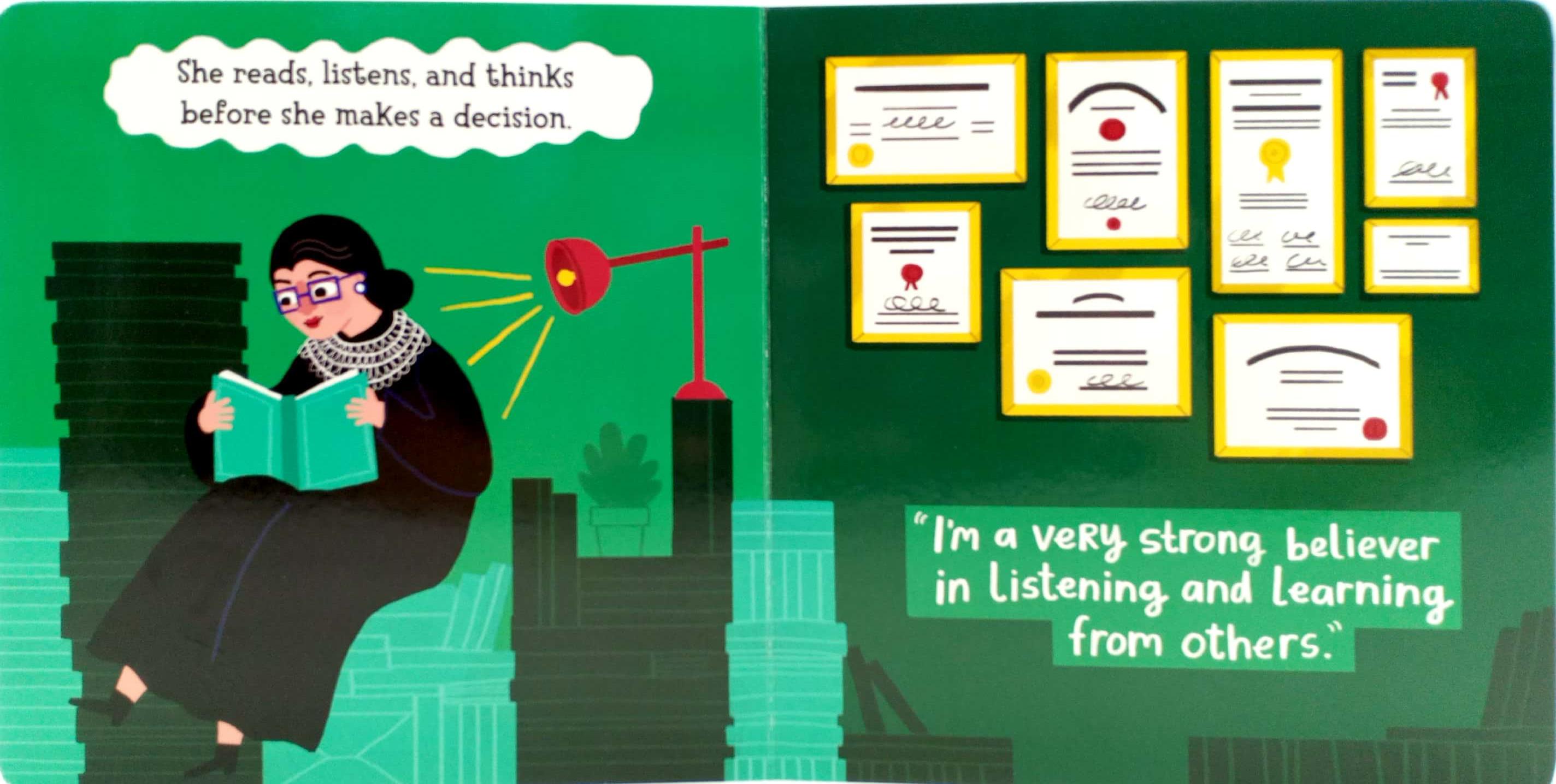 Each spread highlights an important trait, and is enhanced by a quote from RBG herself. Kids will grow up hearing the words of this influential woman and will learn what YOU value in a person!