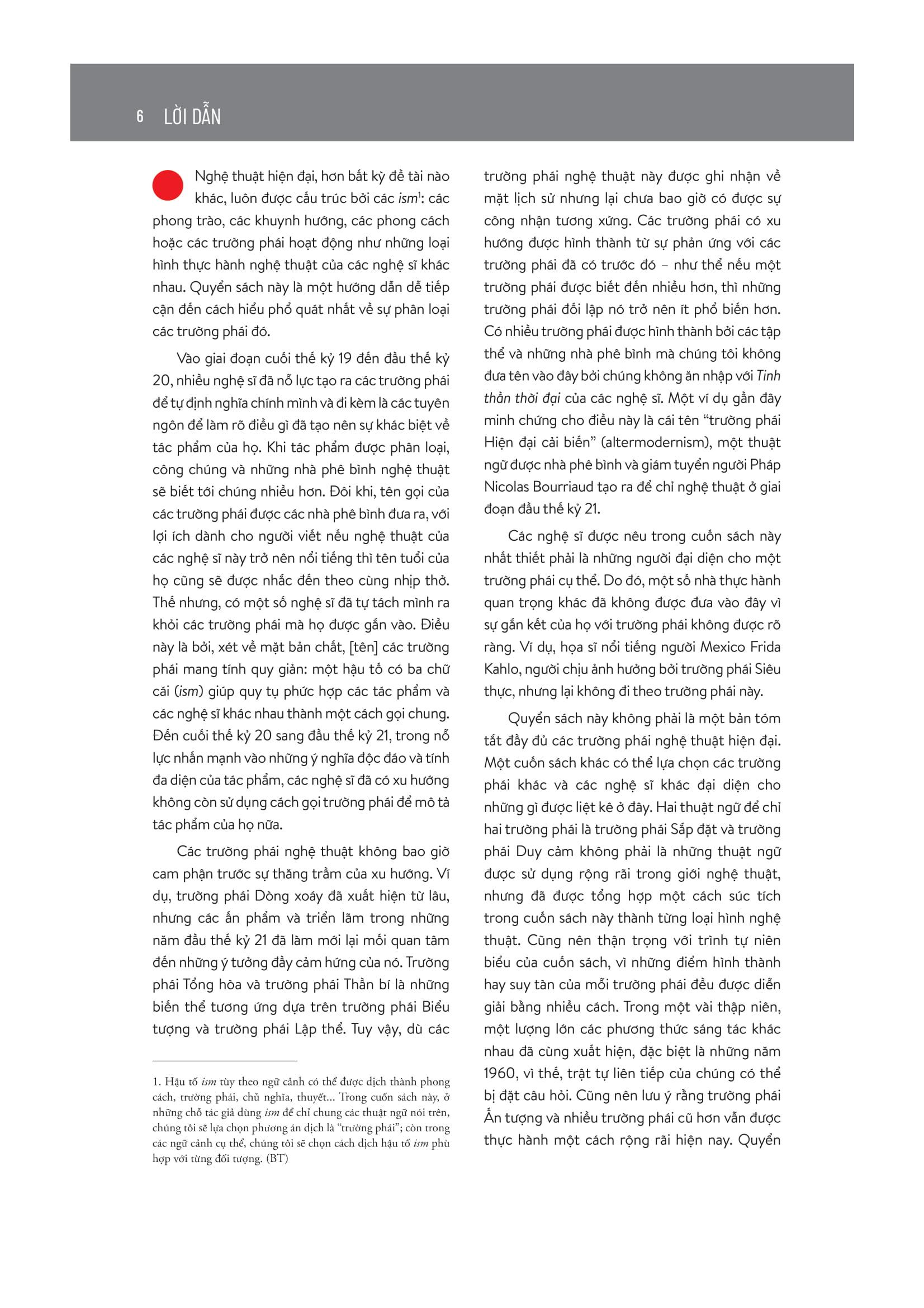 Cuốn sách này là một cẩm nang ngắn gọn giới thiệu cho bạn đọc về 55 trào lưu, trường phái và phong cách thịnh hành từ thời kỳ bình minh hé sáng của nghệ thuật hiện đại cuối thế kỷ 19 cho đến nay, nhằm giúp các bạn làm quen và tiếp cận được một nhánh của dòng chảy lịch sử nghệ thuật.