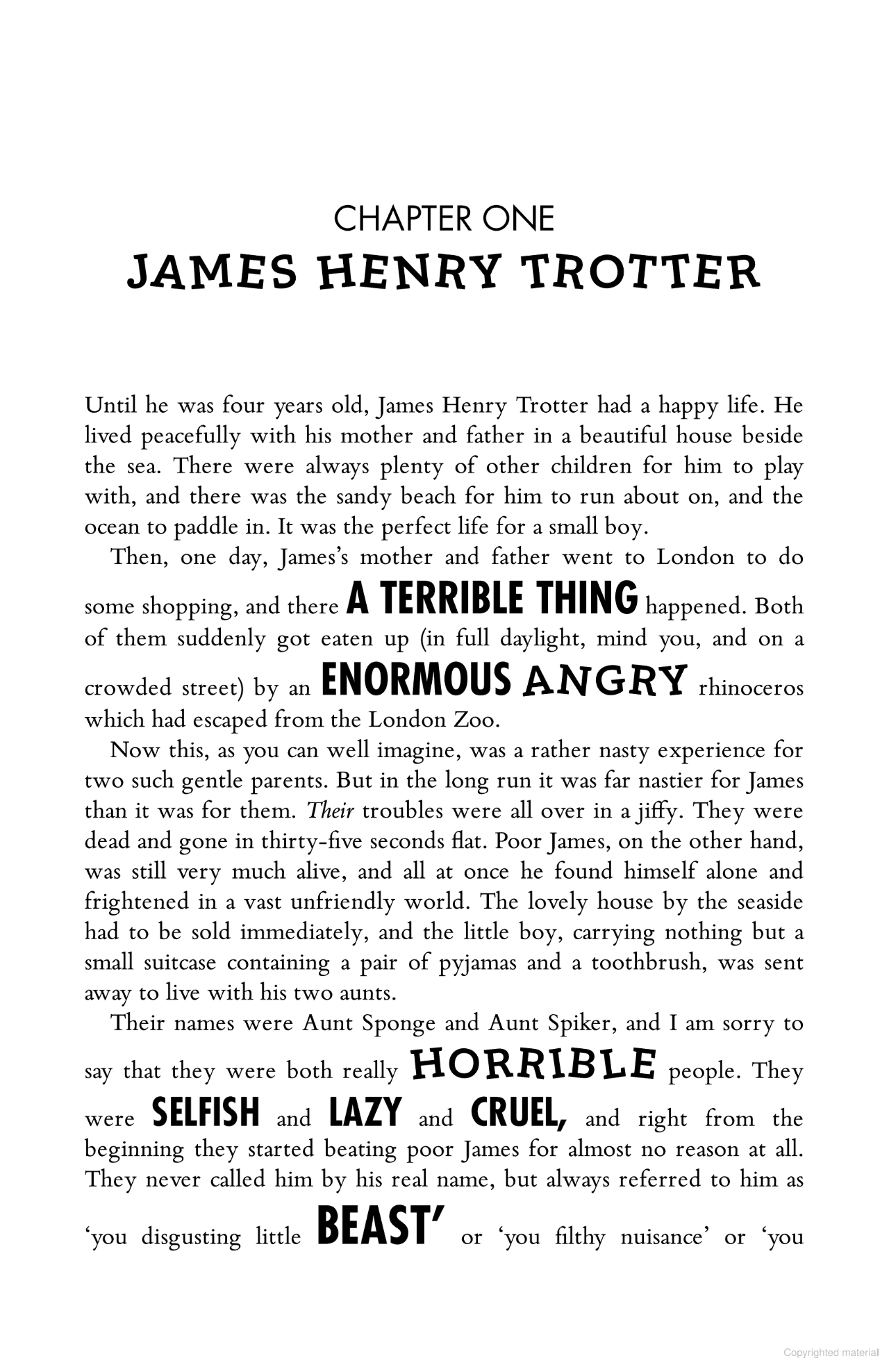 James lives his awful Aunt Sponge and Aunt Spiker, two of the meanest people you can imagine.