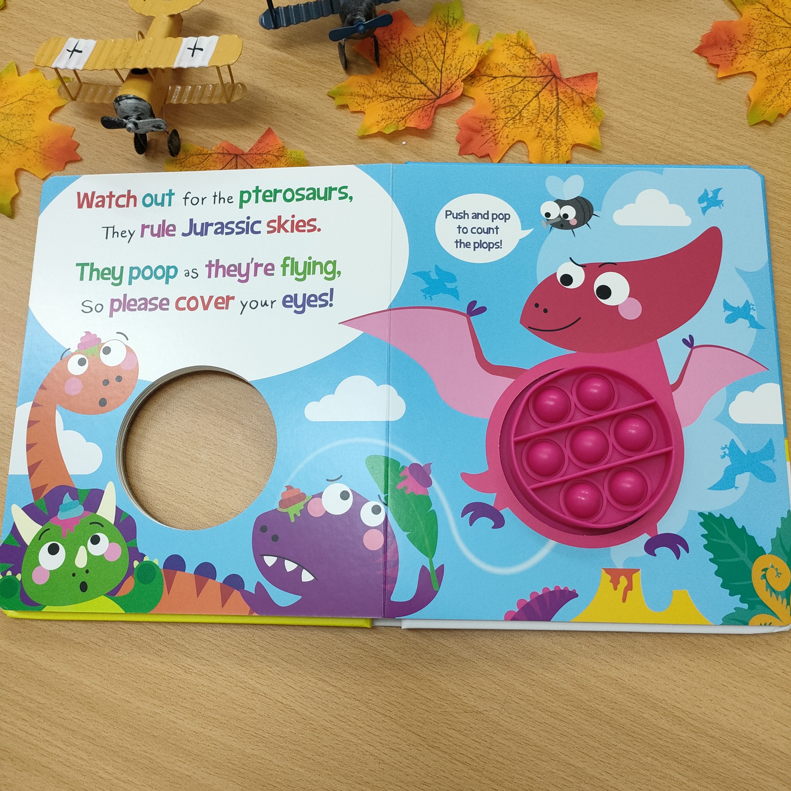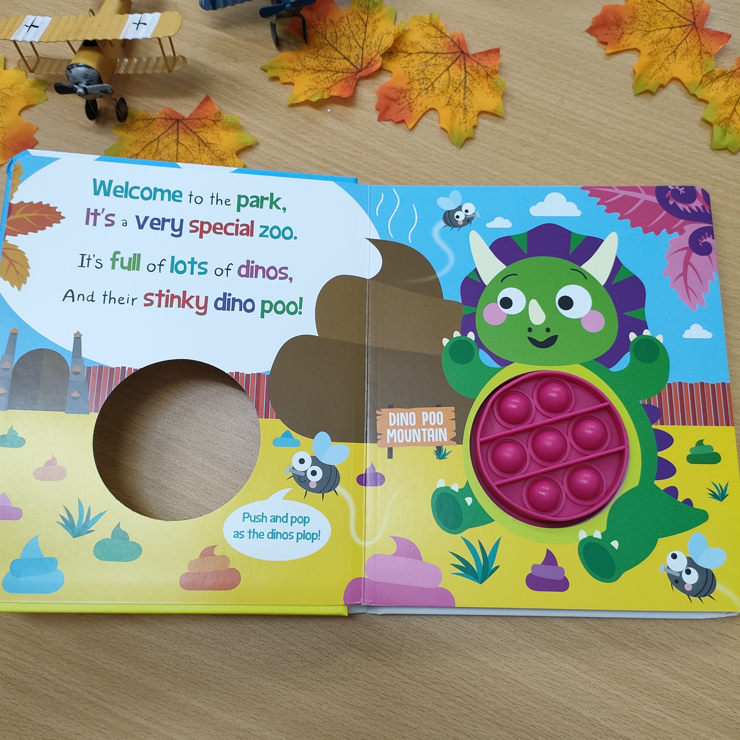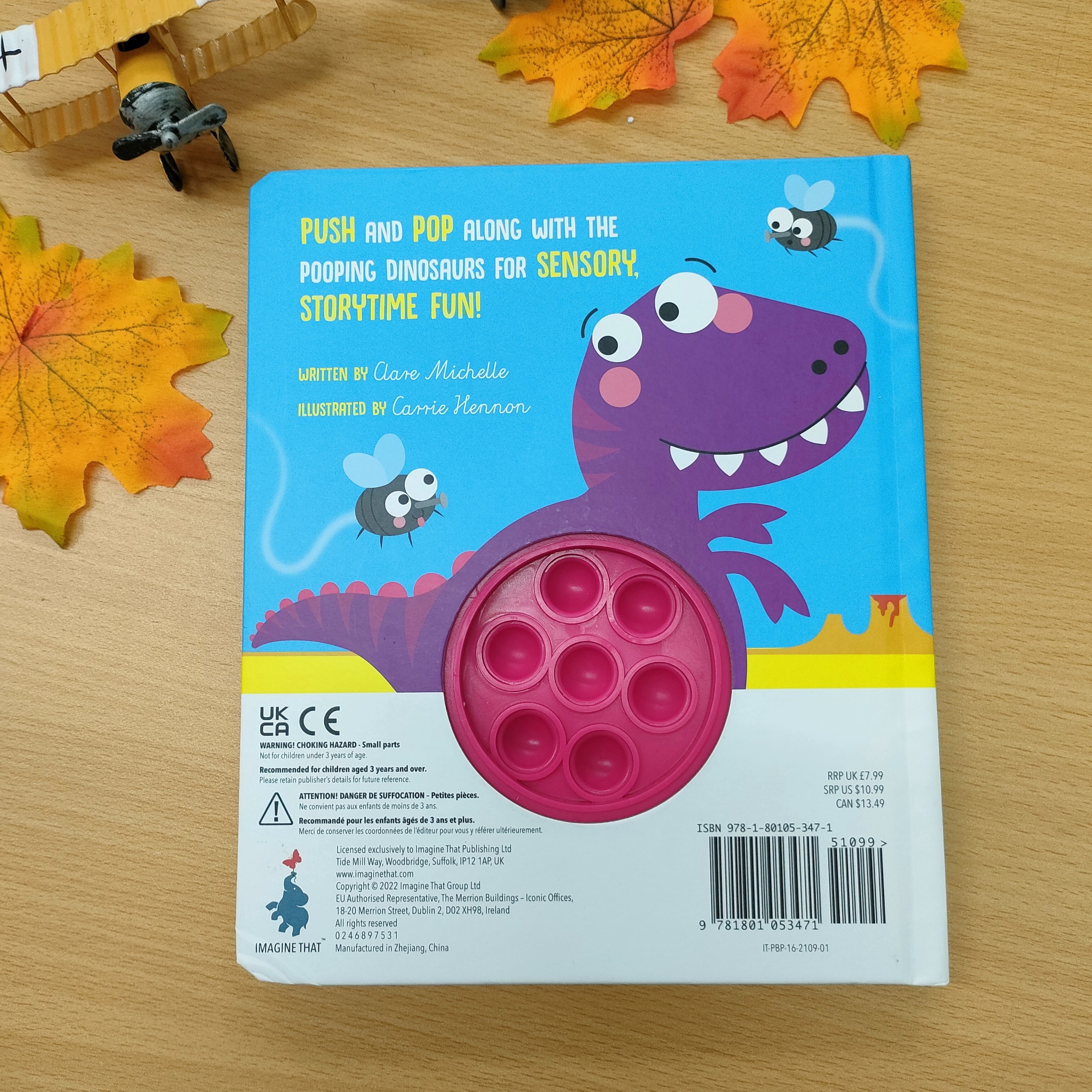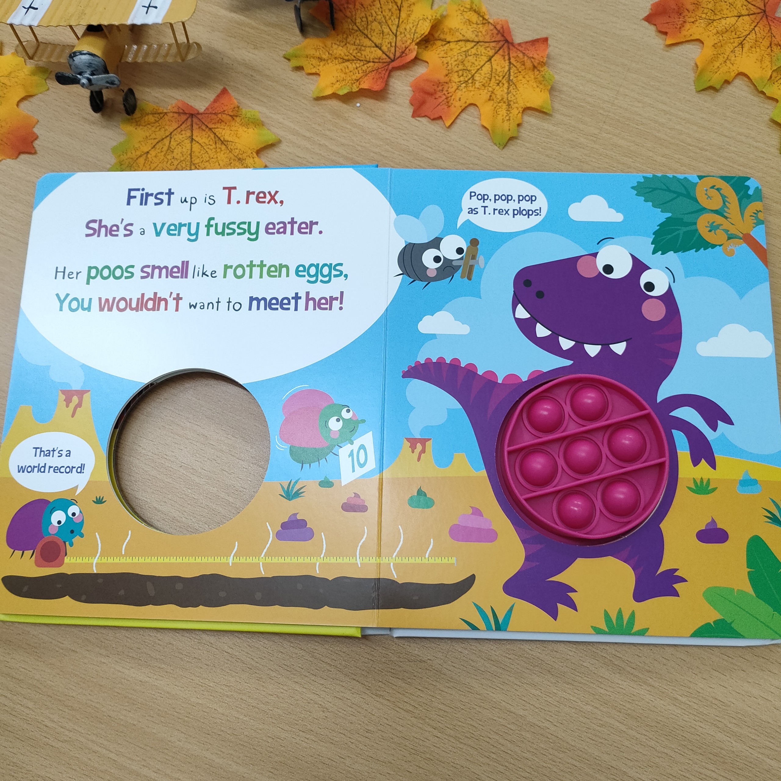 A push and pop sensory story time book for read aloud fun! In this laugh-out-loud story about pooping dinosaurs, there's an innovative silicone popper fidget toy for little hands to push, pop and explore on