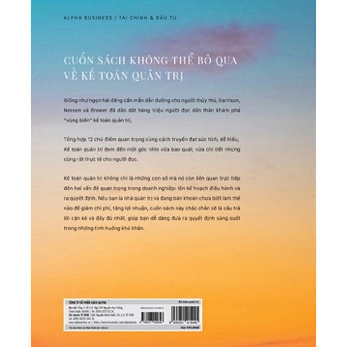 Kế Toán Quản Trị - Managerial Accounting Cuốn sách “nhập môn” không thể bỏ qua về kế toán quản trị Giống như ngọn hải đăng cần mẫn dẫn đường cho người thủy thủ, Kế toán quản trị đã dẫn dắt hàng triệu người đọc dấn thân khám phá “vùng biển” kế toán quản trị. Kế toán quản trị được đánh giá là ấn phẩm dẫn đầu thị trường, được hàng triệu sinh viên, học viên tin tưởng sử dụng suốt nhiều năm. Những điểm cốt lõi của Kế toán quản trị được gói gọn trong ba từ: thực tế, chính xác và rõ ràng. Thực tế: Tất cả kiến thức trong đều nhằm mục tiêu liên kết vấn đề lý thuyết với thực tiễn công việc của nhà quản trị. Các bài tập này sẽ về liên kết tất cả kiến thức trong chương để các học viên, sinh viên có thể nắm bắt trọn vẹn mối liên hệ giữa các vấn đề và có cái nhìn sâu sắc hơn về kế toán quản trị. Chính xác: Kiến thức luôn được cập nhật, sửa đổi và bổ sung để đảm bảo tất cả nội dung đều thống nhất và chính xác nhất. Rõ ràng: 12 chủ điểm quan trọng của kế toán quản trị được phân chia thành từng mục cụ thể, phần nội dung chính, nội dung tham khảo được trình bày tách bạch, rõ ràng, giúp người đọc dễ theo dõi. Kế toán quản trị sẽ là một trong những nguồn tài liệu có giá trị trong việc: