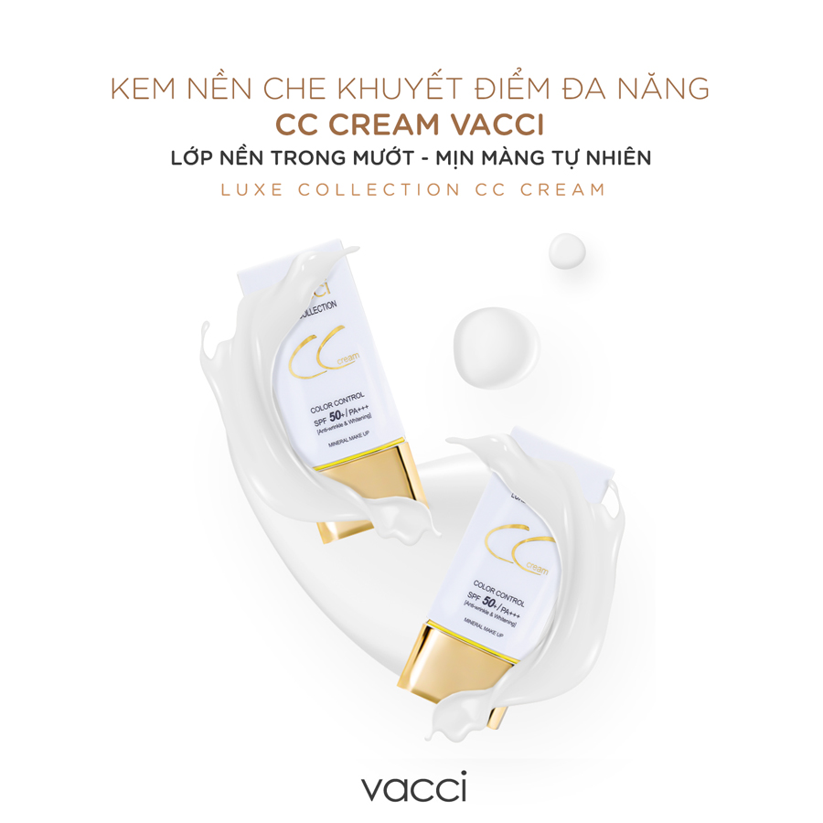 Tên viết tắt của CC là cụm từ “color correction” hay “color control” nghĩa là “CC VACCI cream điều chỉnh màu da”, do đó sản phẩm này tập trung vào việc cải thiện sự đồng đều màu da. Kem Phấn Nền Thế Hệ Mới Dưỡng Trắng Da Đa Chức Năng CC VACCI Cream SPF50+/PA+++ là sản phẩm kem trang điểm đa năng có tác dụng hiệu chỉnh tông màu da, cho làn da đều màu tự nhiên. Chứa những hạt phân tử siêu nhỏ được chiết xuất từ thiên nhiên, có khả năng giúp bảo vệ da khỏi tác nhân bên ngoài, ngăn khói bụi ô nhiễm từ bên ngoài tác động vào da mà không gây kích ứng.