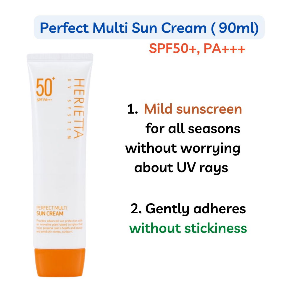 Kem chống nắng Welcos Herietta Perfect Multi Sun Cream là loại kem chống nắng có thành phần từ thảo dược. Kem được sử dụng như kem lót đa năng giúp bảo vệ da khỏi tác động xấu của ánh nắng mặt trời, và là lớp màng ngăn cách bảo vệ da khỏi lớp trang điểm