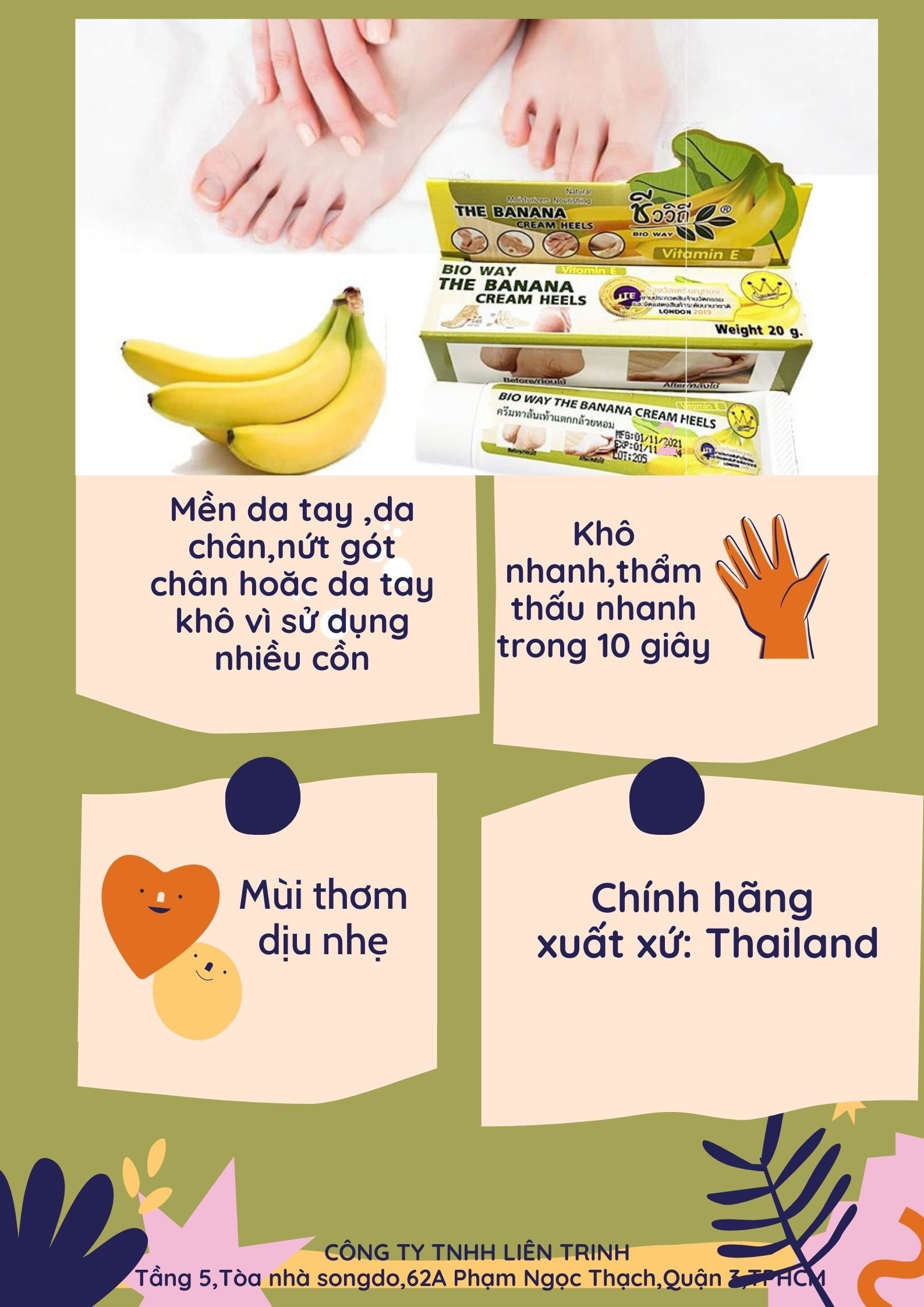 và gót chân BIO WAY THE BANANA CREAM HELLS 20g- Thailand Thành phần: Water,carbomer,mineral oil Cetyl alcohol,ceteareth-20,stearyl alcohol Triethanolamine,petrolatum,tocopheryl acetate Musa paradisiaca fruit extract,petrolatum, Methyl paraben Sản