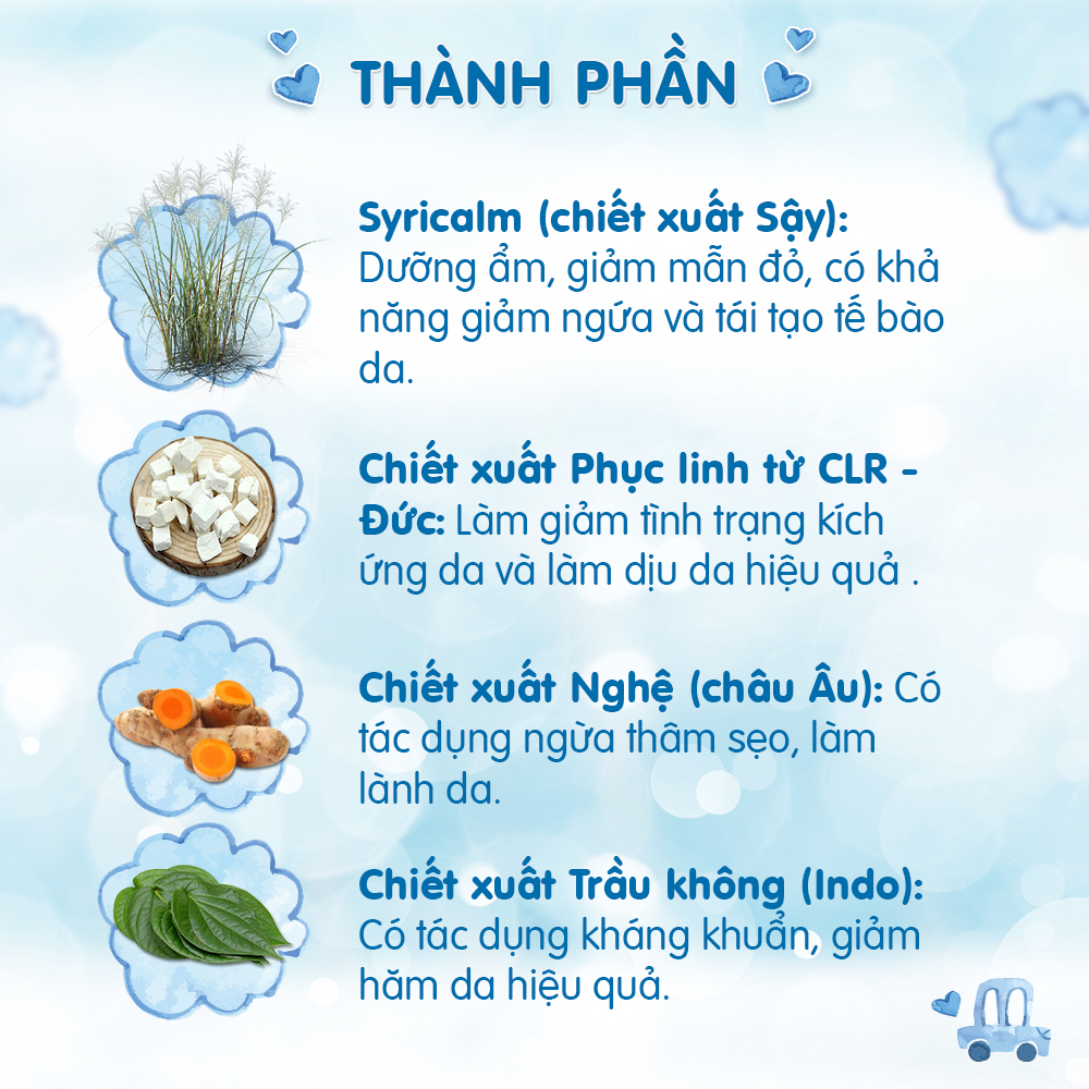 Công dụng Với 85% thành phần có nguồn gốc tự nhiên, sản phẩm có tác dụng: - Bảo vệ làn da bé: Với công thức chiết xuất từ bơ cacao tạo ra lớp bảo vệ