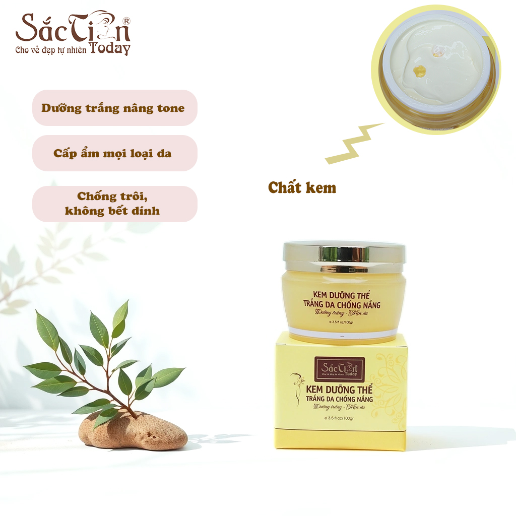 Kem dưỡng thể trắng da chống nắng Sắc Tiên Today với các thành phần giàu Vitamin cùng chiết xuất Cúc La Mã giúp nuôi dưỡng tế bào da khỏe mạnh, dưỡng da trắng sáng, mịn