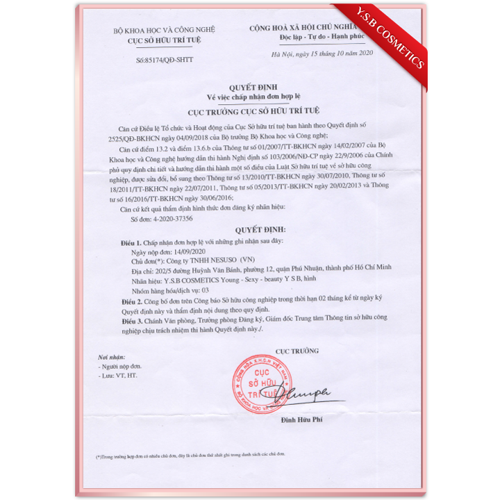 Mỗi sản phẩm Y.S.B COSMETICS đưa ra thị trường là cả một quá trình nghiên cứu, kiểm tra khắc khe và được kiểm nghiệm định kỳ, cấp phép bởi các Cơ quan có thẩm quyền cho phép lưu hành trong nước và quốc tế.