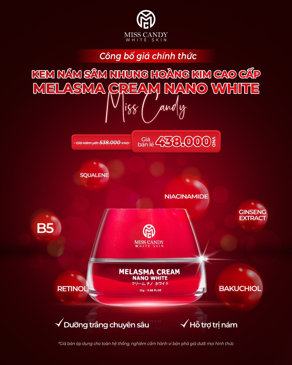 ✨Kem Dưỡng Trắng Da Mờ Thâm Nám Sâm Nhung Hoàng Kim Cao Cấp Melasma Cream Nano White MISS CANDY 25g, Giúp Tái Tạo Da Bị Nhiễm Corticoid, Phục Hồi Làn Da Hư Tổn & Làm Săn Chắc Da