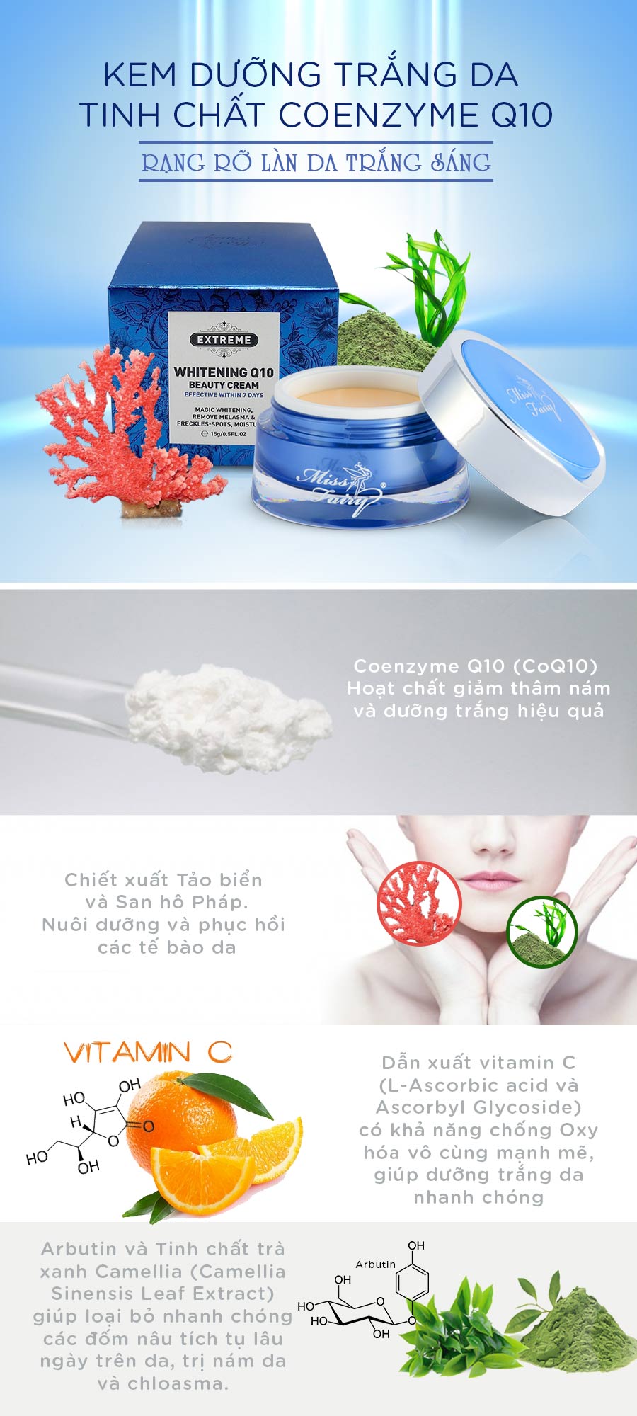 Kem dưỡng trắng da tinh chất Coenzyme Q10 – Đẩy lùi nám sạm, tàn nhang – Rạng rỡ làn da trắng sáng Bí quyết của làn da trắng mịn không tì vếtn đem lại diện mạo rạng rỡ trẻ trung là đây! Kem dưỡng trắng da Coenzyme Miss Fairy được điều chế từ các thành phần cao cấp: San hô tươi và Tảo biển Pháp, kết hợp với Coenzyme Q10 giúp làm mờ vết thâm nám và cải thiện da trắng sáng rõ rệt. Tại sao Coenzyme Q10 dưỡng trắng da, giảm thâm nám hiệu quả? Coenzyme Q10 là một chất chống oxy hóa mạnh, bảo vệ tế bào da khỏi những tổn thương, ngăn quá trình tổng hợp melanin gây ra nám, sạm, dưỡng da trắng sáng rạng rỡ. Chiết xuất Tảo biển và San hô Pháp cấp ẩm và phục hồi những vùng da bị thương tổn, giúp da trở nên căng bóng, mịn màng. Sự kết hợp của Arbutin, Vitamin C và tinh chất Trà Xanh tăng cường hiệu quả làm đều màu da, loại bỏ nhanh chóng các đốm nâu tích tụ lâu ngày trên da, cho làn da trắng sáng bật tông. Ưu điểm của Kem dưỡng trắng da Coenzyme Q10 Miss Fairy
