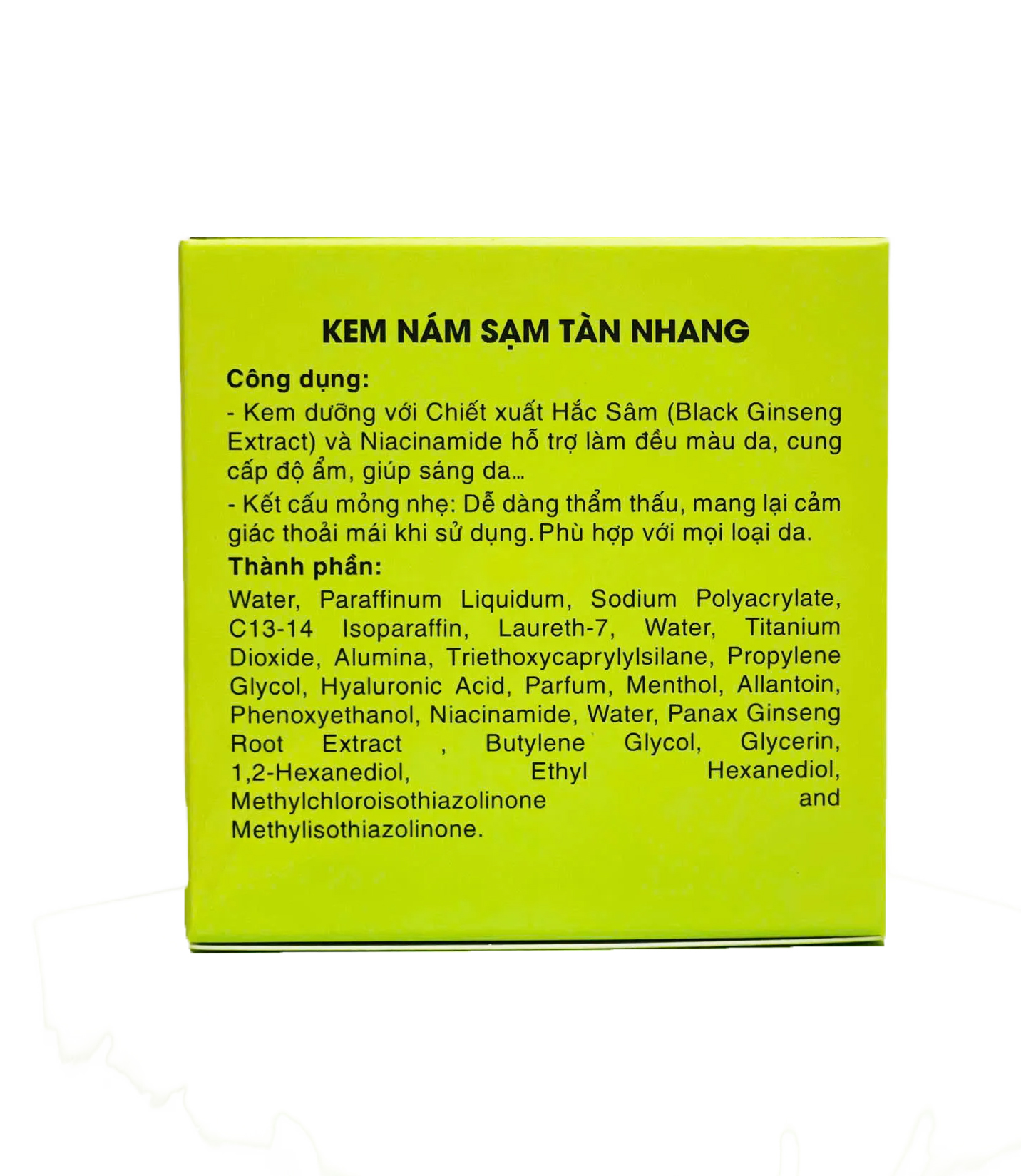 Công dụng: Kem dưỡng với Chiết xuất Hắc Sâm (Black Ginseng Extract) và Niacinamide hỗ trợ làm đều màu da, cung cấp độ ẩm, giúp sáng da… Kết cấu mỏng nhẹ: Dễ dàng thẩm thấu, mang lại cảm giác thoải mái khi sử dụng. Phù hợp với mọi loại da. Thành phần: Water, Paraffinum Liquidum, Sodium Polyacrylate, C13-14 Isoparaffin, Laureth-7, Water, Titanium Dioxide, Alumina, Triethoxycaprylylsilane, Propylene Glycol, Hyaluronic Acid, Parfum, Menthol, Allantoin, Phenoxyethanol, Niacinamide, Water, Panax Ginseng Root Extract , Butylene Glycol, Glycerin, 1,2-Hexanediol, Ethyl Hexanediol, Methylchloroisothiazolinone and Methylisothiazolinone. Hướng dẫn sử dụng: Sau bước làm sạch và cân bằng da, lấy một lượng kem vừa đủ thoa đều lên vùng da cần chăm sóc. Massage nhẹ nhàng để dưỡng chất thẩm thấu tốt hơn. Điều kiện bảo quản: