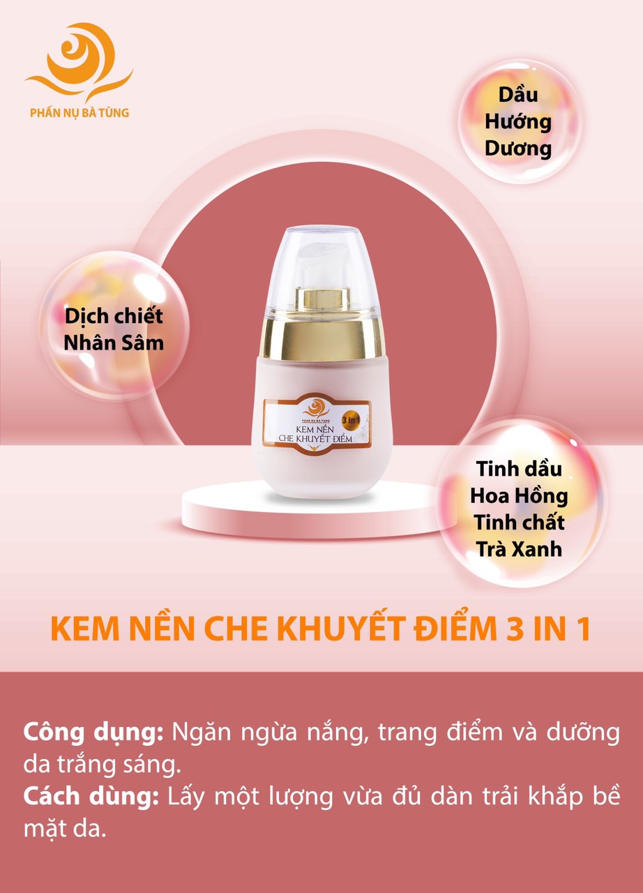 Mua tại TiktokCông dụng: Đây là sản phẩm vượt trội với ba công dụng: ngăn ngừa nắng, trang điểm vàdưỡng da trắng sáng. Có tác dụng tạo lớp nền che phủ tự nhiên mỏng mịn, tăng độ đàn hồi da, giảm thiểu nếp nhăn và lỗ chân lông giúp da mịn màng, trắng sáng. Với kết cấu hạt nhỏ siêu mịn che đi những khuyết điểm trên da, tạo cho bạn một làn da hoàn hảo. Cách dung Lấy một lượng vừa đủ dàn trải khắp bề mặt da. Thành phần Sáp ong, Dầu hướng dương, Dịch chiết Nhân sâm, Tinh chất trà xanh,Tinh dầu hoa hồng, Nước tinh khiết. Bảo quản Nơi khô ráo và thoáng mát.Tránh ánh nắng trực tiếp và nhiệt độ cao. HD: 2 năm kể từ ngày sản xuất.