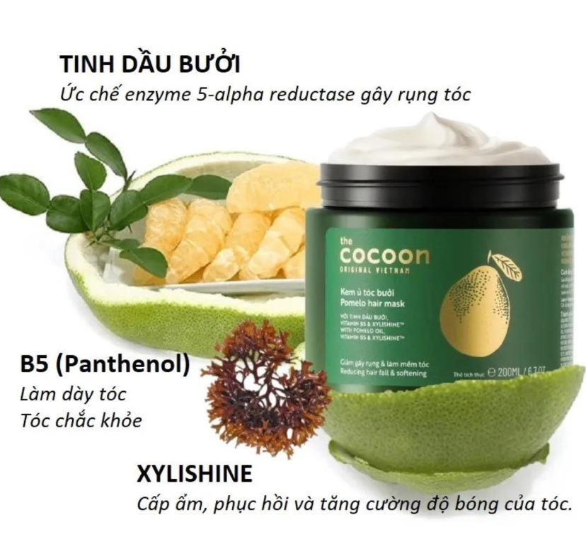 Mua tại TiktokKem ủ tóc với tinh dầu bưởi truyền thống Việt Nam, Vitamin B5 và Xylishine giúp giảm gãy rụng, cung cấp độ ẩm, mang lại sự mềm mại và chắc khoẻ cho sợi tóc. Tinh dầu bưởi được trích ly từ vỏ bưởi chứa hàm lượng lớn limonene có khả năng ức chế mạnh mẽ enzyme 5-alpha reductase trên da đầu - nguyên nhân chính gây rụng tóc. Đồng thời do có tính kháng khuẩn và chống oxy hóa cao, tinh dầu vỏ bưởi sẽ mang lại cho bạn da đầu và tóc khỏe mạnh.