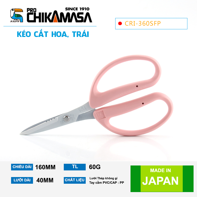 Kéo cắt cành cây Chikamasa CRI-360 nhẹ nhàng, chuyên cắt cọng hoa. Sản phẩm này được tiệm hoa, thầy cô cắm hoa trong Hoa đạo và các chuyên gia cắm hoa ở Nhật Bản ưa