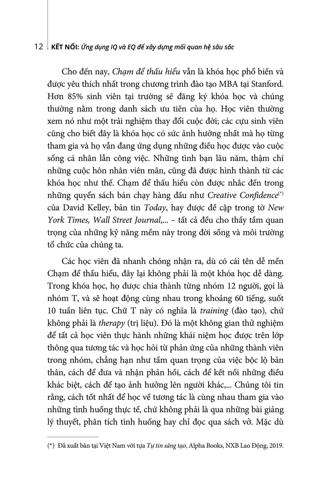 KẾT NỐI Ứng dụng IQ và EQ để xây dựng mối quan hệ sâu sắc Các mối quan hệ nằm trải dài trên một thang đo nhiều mức độ Mạng xã hội tạo cho chúng ta áp lực phải tích cực hóa mọi chuyện. Bạn có thể đăng lên ok bức ảnh tươi cười trước tháp Eiffel, nhưng không ai biết thực tế chuyến đi đó đối với bạn khủng khiếp như thế nào. Hàng trăm người theo dõi qua ram sẽ biết bạn gọi món gì trong bữa tối sang trọng tuần trước, nhưng chỉ những người có mối quan hệ đặc biệt với bạn mới biết bạn đang phải vật lộn với căn bệnh tiêu hóa suốt nhiều năm nay, hoặc biết trong bữa tối đó, bạn và người yêu đã bàn đến chuyện cùng nhau xây dựng tổ ấm hoặc cân nhắc những được mất của quyết định nghỉ việc. Đây chắc chắn là những chủ đề mà bạn sẽ không bao giờ đề cập với những người bạn trung học đã lâu không gặp hoặc những người đồng nghiệp chỉ thân thiết ở mức xã giao; đương nhiên, chúng cũng không phải là chủ đề thích hợp để trò chuyện cùng người cô mà bạn đến thăm hằng tuần. Nhưng những người có mối quan hệ đặc biệt với bạn sẽ biết điều gì đang thực sự xảy ra chỉ đơn giản vì họ hiểu bạn. Các mối quan hệ nằm trải dài trên một thang đo nhiều mức độ. Ở những mức độ thấp nhất, điều tồn tại giữa bạn và người kia là chỉ là mối liên hệ chứ không phải là sự kết nối. Nhưng khi mối quan hệ nằm ở đầu bên kia thang đo, bạn sẽ cảm thấy an toàn, được thấu hiểu, hỗ trợ, động viên và chấp nhận. Ở phần giữa thang đo, đó sẽ là những người cho bạn cảm giác gắn kết, nhưng trong số đó bạn chỉ muốn kết nối sâu sắc với một vài người. Câu hỏi đặt ra ở đây là: Làm thế nào để mối quan hệ của bạn với ai đó có thể tiến đến đầu bên kia của thang đo? Kết nối - Cuốn sách giúp bạn tạo dựng mối quan hệ sâu sắc Cuốn sách “Kết nối - Ứng dụng IQ và EQ để xây dựng mối quan hệ sâu sắc” sẽ giúp bạn đọc và khách hàng trả lời câu hỏi trên. Những mối quan hệ đặc biệt hoàn toàn có thể được xây đắp, vun vén. Chúng sở hữu 6 dấu hiệu sau đây: