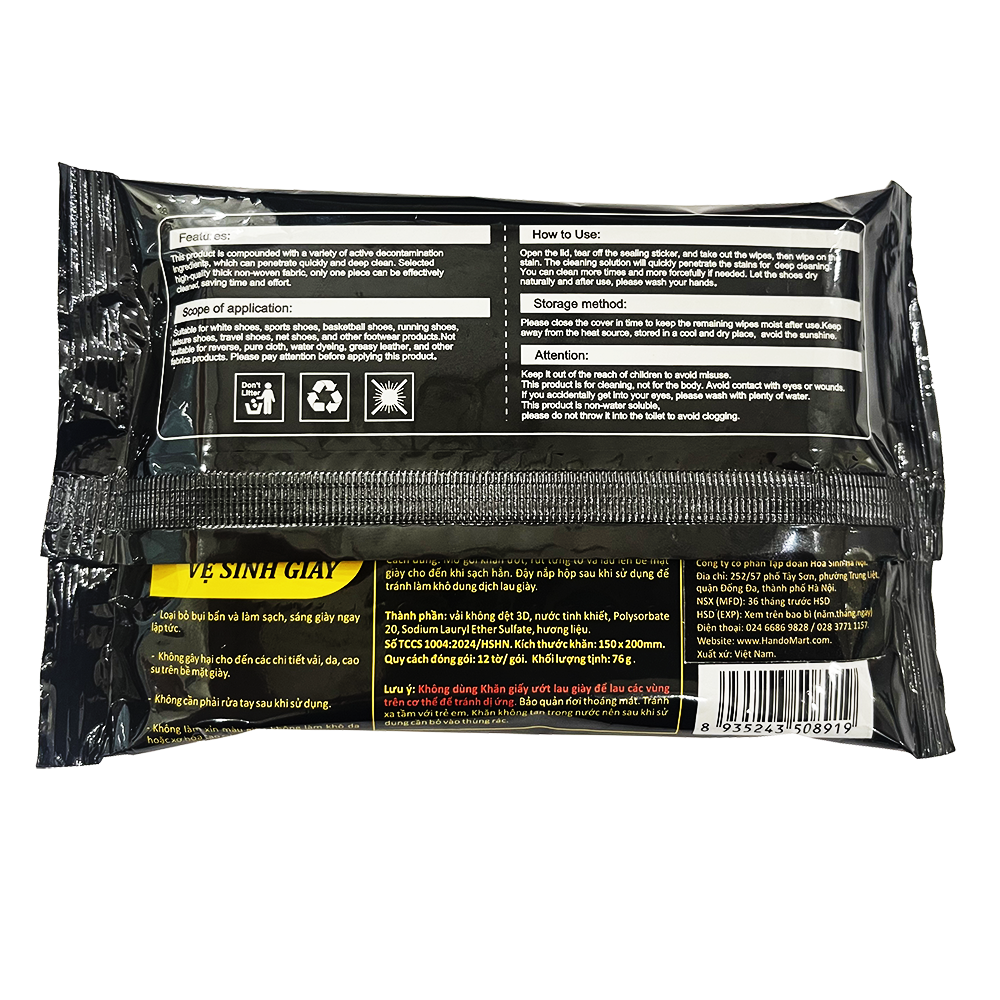 Mô tả sản phẩm Tác dụng, tính năng Khăn lau vệ sinh giày Hando + Làm sạch các vết bẩn, vết ố nhanh chóng, giúp đôi giày của bạn sáng bóng, trắng sạch như mới