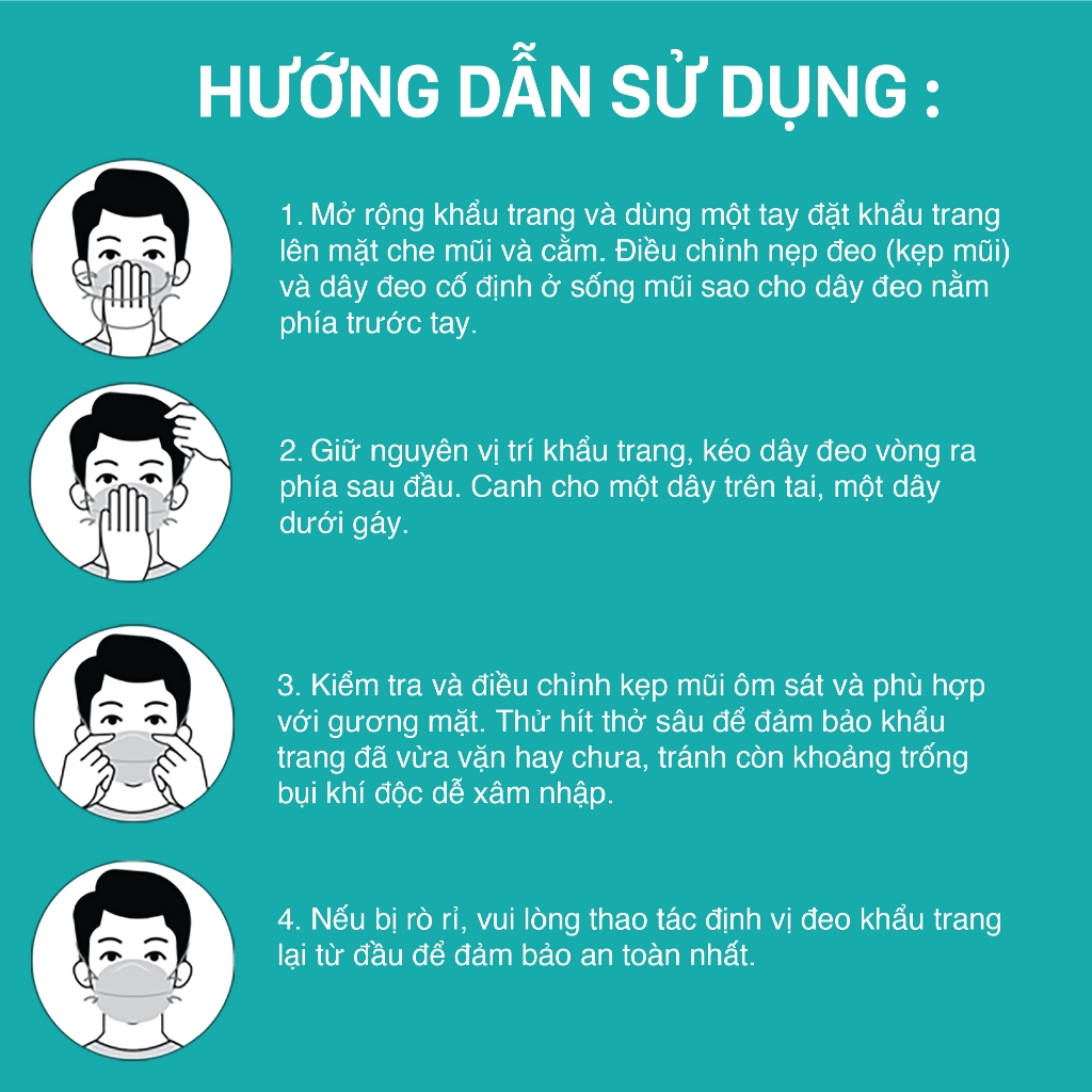 - Hai dây thun đeo ra phía sau gáy thay vì đeo vào tai như các loại khẩu trang thông thường. Đặc biệt, quai đeo có thể điều chỉnh độ dài ngắn. HƯỚNG DẪN SỬ DỤNG: