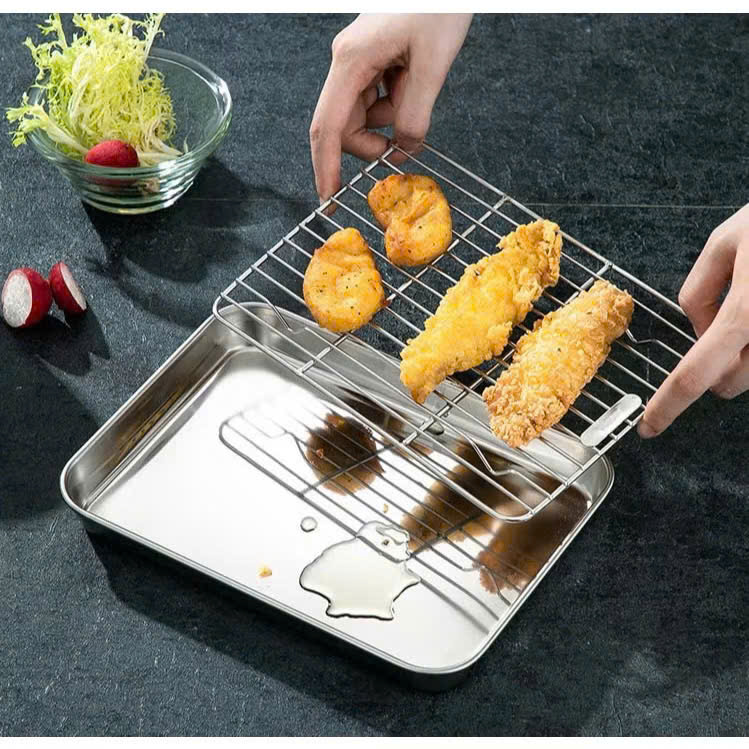 Khay Nướng Inox 304 Dày Dặn Kèm Vỉ Hấp Hình Chữ Nhật Dùng Nướng Bánh, Thực Phẩm