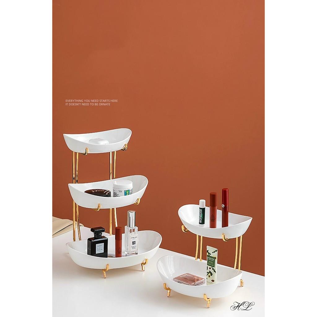 ✨KHAY SỨ ĐỰNG BÁNH KẸO HOA QUẢ HAI TẦNG KHUNG KIM LOẠI MẠ VÀNG CAO CẤP - TRẮNG
