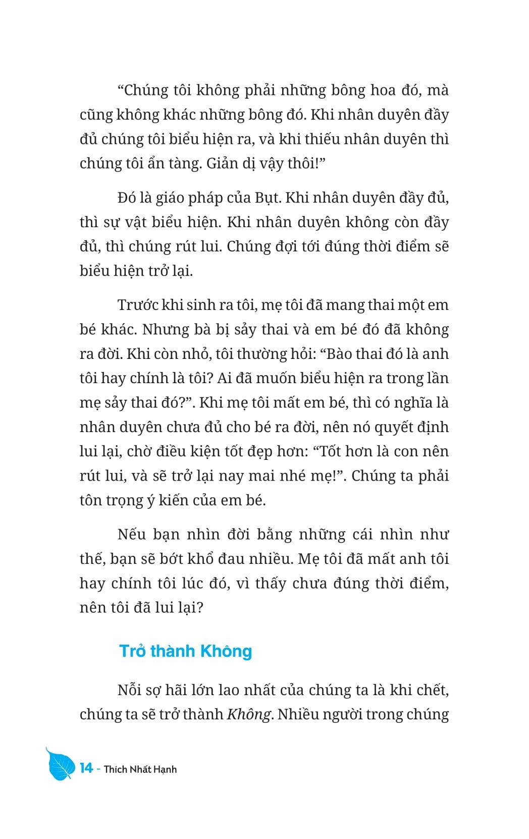 Tri kiến về sống, chết của Thầy vô cùng vi tế và đẹp đẽ. Cũng như những điều vi tế, đẹp đẽ khác, cách thưởng thức hay nhất là thiền quán trong thinh lặng. Lòng nhân hậu và từ bi phát xuất từ suối nguồn thâm tuệ của Thiền sư Thích Nhất Hạnh là một loại thuốc chữa lành những vết thương trong trái tim chúng ta.