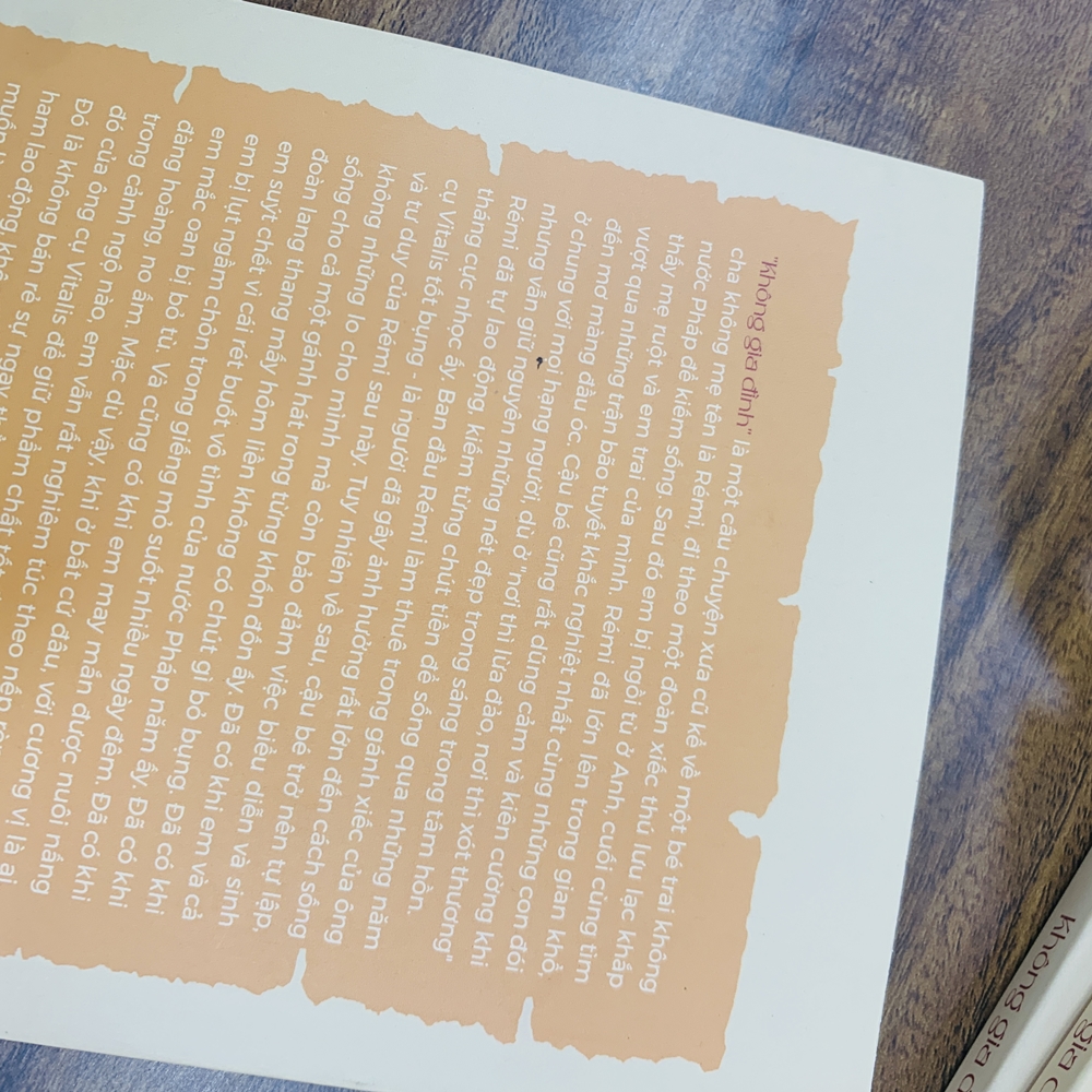 Cuốn sách là hành trình phiêu lưu của Rémi, một câu bé mồ côi từ nhỏ. Cái tên “Không gia đình” gợi lên sự buồn bã, cô đơn, song, khi đọc tác phẩm, ta lại thấy được sự lạc quan, yêu đời trong từng hoàn cảnh, trong mọi tình huống, bên cạnh cậu luôn là những người tốt giúp đỡ. Một tác phẩm đã lấy đi nước mắt nhưng cũng để lại nụ cười cho nhiều độc giả dù là lớn đến bé.
