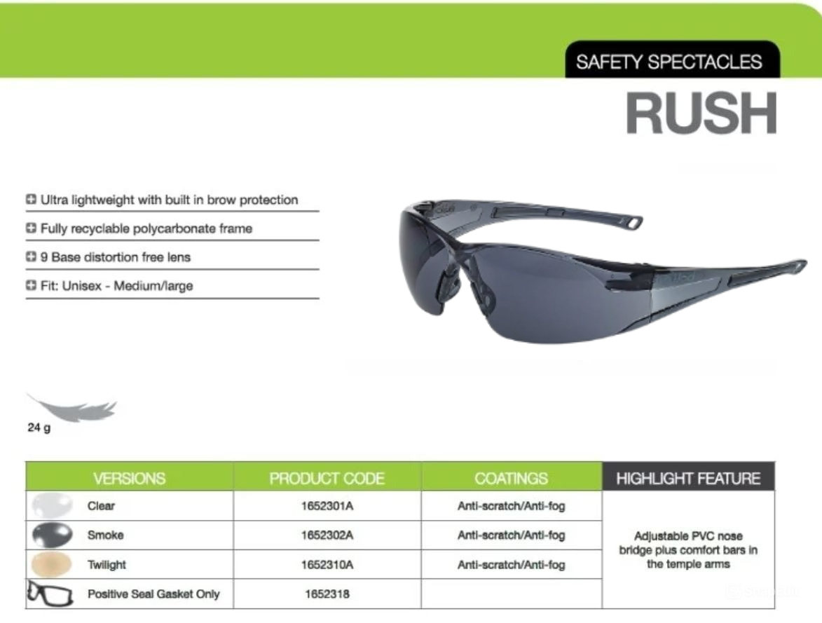 BOLLE 1652302A Rush – Smoke Lens Sun Glasses Lightweight, contoured frame with a velvet finish over hydrated nylon. Approved to AS/NZS 1337.1.2010 for Medium Impact Protection // BOLLE 1652302A Rush – Kính râm có thấu kính khói, gọng nhẹ, có đường viền với lớp nhung phủ trên nylon ngậm nước. Được phê duyệt theo AS/NZS 1337.1.2010 để Bảo vệ Tác động Trung bình. Rush Safety Glasses – Smoke Lens //Kính bảo hộ Rush – Tròng kính khói Features // Đặc trưng Ultra light weight // Trọng lượng siêu nhẹ Built in brow protection // Bảo vệ lông mày tích hợp Single piece, optically correct, 9 base and distortion free lens // Một mảnh, chính xác về mặt quang học, 9 chân đế và ống kính không bị biến dạng “ALS” anti-fog/anti-scratch coating on both sides of Clear, Smoke and Twilight lenses // Lớp phủ chống sương mù/chống trầy xước “ALS” trên cả hai mặt của thấu kính Clear, Smoke và Twilight Fully recyclable: All polycarbonate frame with no metal parts // Có thể tái chế hoàn toàn: Toàn bộ khung bằng polycarbonate không có bộ phận kim loại Fit: Unisex – medium/large HÀNG CHÍNH HÃNG BOLLE The Bolle brand Sun Glasses have been at the forefront of fashionable, protective eyewear for over 50 years. Through innovative product design, they have developed a diverse range of affordable safety eyewear that is both functionable and stylish // Thương hiệu Kính râm Bolle đã đi đầu trong lĩnh vực kính bảo vệ, thời trang trong hơn 50 năm. Thông qua thiết kế sản phẩm sáng tạo, họ đã phát triển nhiều loại kính mắt an toàn giá cả phải chăng, vừa có chức năng vừa phong cách.