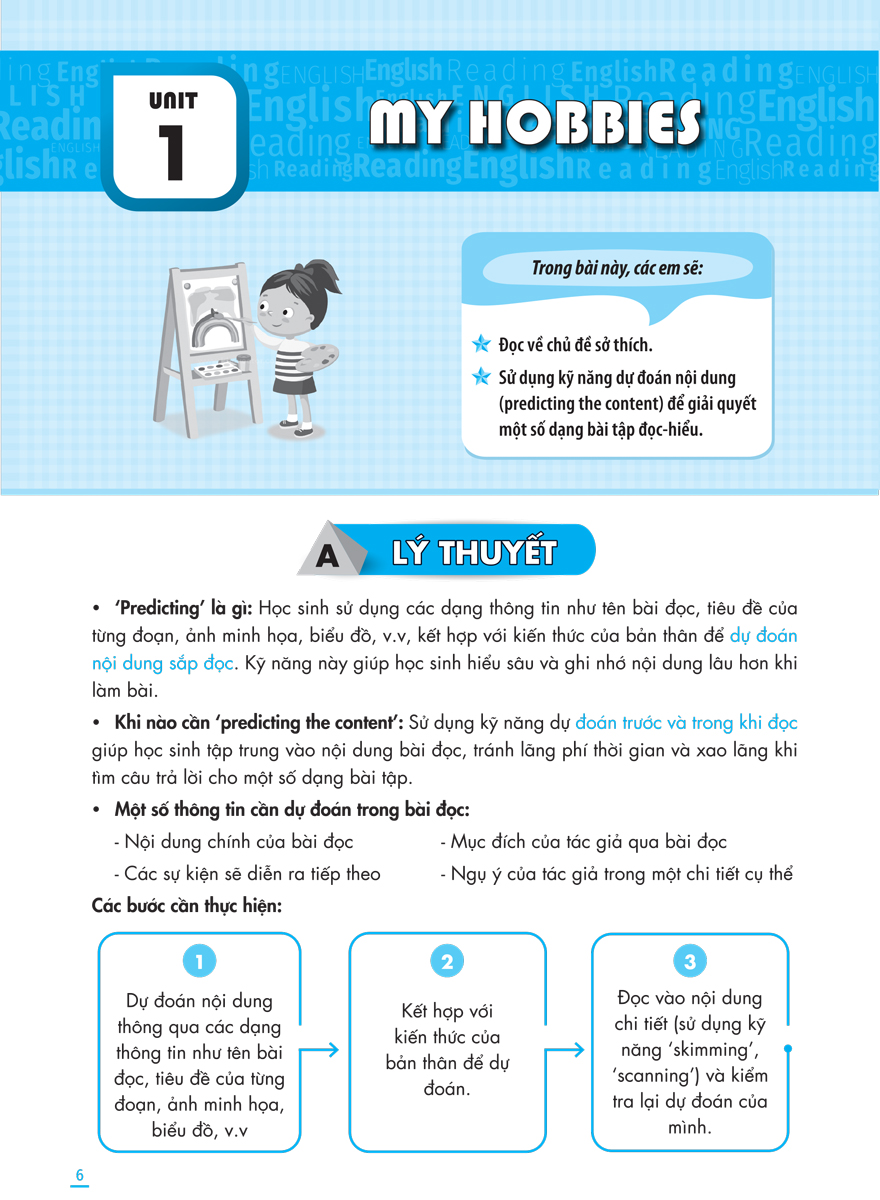 Giới thiệu các kỹ năng đọc hiểu lồng ghép vào chủ đề bài học, có hướng dẫn từng bước cụ thể, giúp học sinh dễ dàng ghi nhớ và vận dụng.