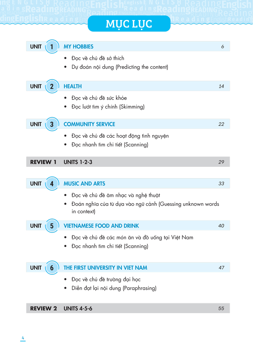Nhằm giúp các em học sinh THCS có một bộ tài liệu để rèn luyện và nâng cao kỹ năng đọc hiểu, đội ngũ biên soạn tâm huyết của Megabook đã cho ra đời bộ sách mang tên “Kỹ năng đọc hiểu tiếng Anh” bao gồm 4 cuốn từ đến. Mỗi cuốn sách được chia làm các chủ đề khác nhau, mỗi chủ đề gồm 2 phần Lý thuyết - Bài tập tương ứng bám sát khung chương trình Tiếng anh cấp Trung học cơ sở của Bộ Giáo dục và Đào tạo. Mỗi chủ đề sẽ lồng ghép, giới thiệu tới các em các kỹ năng đọc hiểu cùng các bài tập đa dạng với nhiều cấp độ, giúp các em củng cố và rèn luyện thành thục các kỹ năng vừa học.