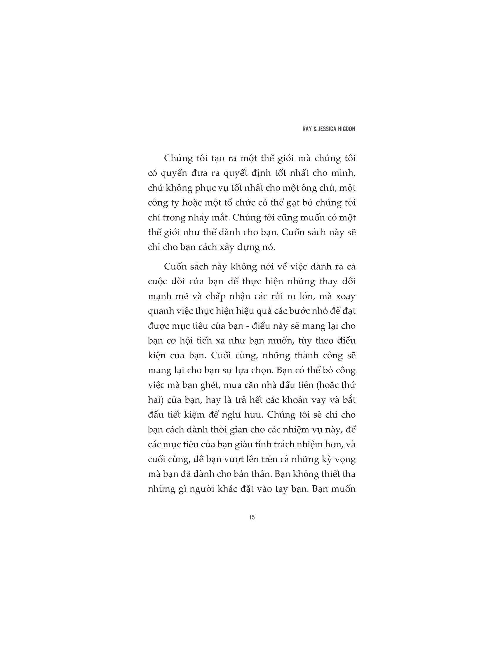 Bên cạnh đó, cuốn sách đưa ra những lời khuyên thiết thực theo từng bước để thúc đẩy bạn hành động, nhằm đạt được sự tự do về công việc, tài chính và tìm thấy lẽ sống của cuộc đời. Cuốn sách này không nói về việc dành ra cả cuộc đời của bạn để thực hiện những thay đổi mạnh mẽ và chấp nhận các rủi ro lớn, mà xoay quanh việc thực hiện hiệu quả các bước nhỏ để đạt được mục tiêu của bạn - điều này sẽ mang lại cho bạn cơ hội tiến xa như bạn muốn, tùy theo điều kiện của bạn.