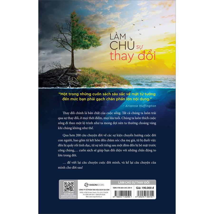 LÀM CHỦ SỰ THAY ĐỔI Vực dậy sau biến cố Bạn đã bao giờ tự hỏi câu chuyện cuộc đời mình? Hãy dừng lại một giây và lắng nghe câu chuyện đang diễn ra trong đầu bạn. Nó lẩn khuất đâu đó bên trong bạn. Đó là câu chuyện bạn kể cho người khác nghe khi gặp họ lần đầu tiên. Đó là những gì bạn tự nói với chính mình khi bạn xem một bức ảnh cũ, khi bạn ăn mừng một thành tích, khi bạn vội vã chạy đến bệnh viện. Đó là câu chuyện về việc bạn là ai, bạn từ đâu đến, bạn mơ ước sẽ đi đến đâu trong tương lai. Đó là điểm đỉnh cao trong cuộc đời bạn, là điểm chạm đáy, hay điểm bước ngoặt. Đó là điều bạn tin tưởng, bạn tranh đấu, bạn coi trọng nhất trong đời. Đó là câu chuyện cuộc đời bạn. Và câu chuyện đó không chỉ là một phần của bạn, mà nó đại diện cho chính bạn. Cuộc sống là một câu chuyện mà bạn kể cho chính mình nghe. Cách bạn nhìn nhận chính mình trong câu chuyện đó – bạn là một người hùng, một nạn nhân, một người tình, một chiến binh, một người chăm sóc, hay một tín đồ – có tầm quan trọng đáng kể. Cách bạn tiếp nhận và thích ứng với câu chuyện – bạn thay đổi, điều chỉnh, viết lại nó khi mọi thứ trong đời bạn chao đảo, đổi thay, hoặc gặp trục trặc – thậm chí còn quan trọng hơn nữa. Cuộc sống của bạn đầy những biến đổi đang xảy đến Những bộ óc thông minh nhất hiện nay – bao gồm những nhà nghiên cứu máy tính, sinh học, toán học, vật lý – đã hiểu ra rằng thế giới không còn tuân theo con đường tuyến tính, có thể đoán trước được nữa. Thay vào đó, cuộc sống chứa đầy sự hỗn loạn và phức tạp, các giai đoạn trật tự và rối loạn, tuyến tính và phi tuyến tính. Thay cho các đường thẳng ổn định, giờ đây chúng ta sẽ nhìn thấy các vòng lặp, xoắn ốc, dao động, bẻ gãy, xoắn, rối và cong gập. Ý tưởng cho rằng cuộc sống tuân theo một loạt các tiến trình tuyến tính – từ ấu thơ, trưởng thành, trung niên đến về già; từ hẹn hò, kết hôn, sinh con đến cô độc; từ công việc cấp thấp, cấp trung, cấp cao đến hưu trí – dường như đã lỗi thời. Thay vì trải qua một loạt các giai đoạn cuộc đời định sẵn với những cuộc khủng hoảng định kỳ vào những dịp sinh nhật lần thứ chẵn chục, chúng ta trải nghiệm cuộc sống như một vòng xoáy phức tạp của những kỷ niệm, thất bại, chiến thắng và sự gây dựng lại trong suốt cuộc đời mình. Kỳ vọng thường lệ trước đây rằng mọi người sẽ có một công việc, một mối quan hệ, một đức tin, một mái ấm, một cơ thể lành lặn, một xu hướng tính dục, một danh tính về tuổi vị thành niên cho đến tuổi già đã hoàn toàn không còn tồn tại. Đây chính là những gì được gọi là cuộc sống tuyến tính và nó để lại hậu quả sâu sắc cho những quyết định chúng ta đưa ra hằng ngày. Vì tất cả những lợi ích của việc sống phi tuyến tính – tự do cá nhân, tự thể hiện bản thân, sống theo cách của riêng bạn hơn là sống theo cách người khác muốn bạn sống – hậu quả lớn nhất là nó buộc tất cả chúng ta phải lèo lái một loạt các biến đổi gần như choáng ngợp trong cuộc đời. Chuyển đổi đang đến, hãy chuẩn bị các kỹ năng với “Làm chủ sự thay đổi” Ít ai lường trước được mức độ của các sự kiện thay đổi cuộc đời, vì chúng ta phải đối mặt với nhiều trải nghiệm thay đổi hơn mong đợi và con số chỉ có khả năng tăng lên trong những năm tới, nên việc thành thạo các kỹ năng cần thiết để vượt qua chúng là điều cấp thiết. Các chấn động có thể mang tính tự nguyện hoặc không, nhưng lèo lái các biến đổi xảy ra do chúng thì chỉ có thể là tự nguyện. Chúng ta phải tự trang bị cho mình các kỹ năng này với “Life Is in the Transitions”. Bị khủng hoảng cá nhân, Bruce Feiler đã dành vài năm qua để đi khắp đất nước, thu thập hàng trăm câu chuyện cuộc đời ở tất cả năm mươi tiểu bang từ những người Mỹ đã trải qua những thay đổi lớn trong cuộc sống — từ mất việc làm đến mất người thân; từ thay đổi nghề nghiệp sang thay đổi các mối quan hệ; từ việc tỉnh táo để trở nên khỏe mạnh đến đơn giản là tìm kiếm một khởi đầu mới. Sau đó, anh ấy đã dành một năm để viết lại những câu chuyện này, xác định các mô hình và tìm ra điểm chung có thể giúp tất cả chúng ta tồn tại và phát triển trong thời kỳ thay đổi. “Life Is in the Transitions - Làm chủ sự thay đổi” giới thiệu cái nhìn mới mẻ, sáng tạo về cuộc sống phi tuyến, trong đó mỗi chúng ta phải đối mặt với hàng loạt yếu tố gây rối. Một phần mười trong số đó trở thành cái mà Feiler gọi là cuộc sống, một sự thay đổi lớn dẫn đến sự chuyển đổi cuộc đời. Thời gian trung bình của các quá trình chuyển đổi này là 5 năm. Kết quả: Tất cả chúng ta đều dành nửa cuộc đời của mình trong trạng thái bất ổn này. Điều