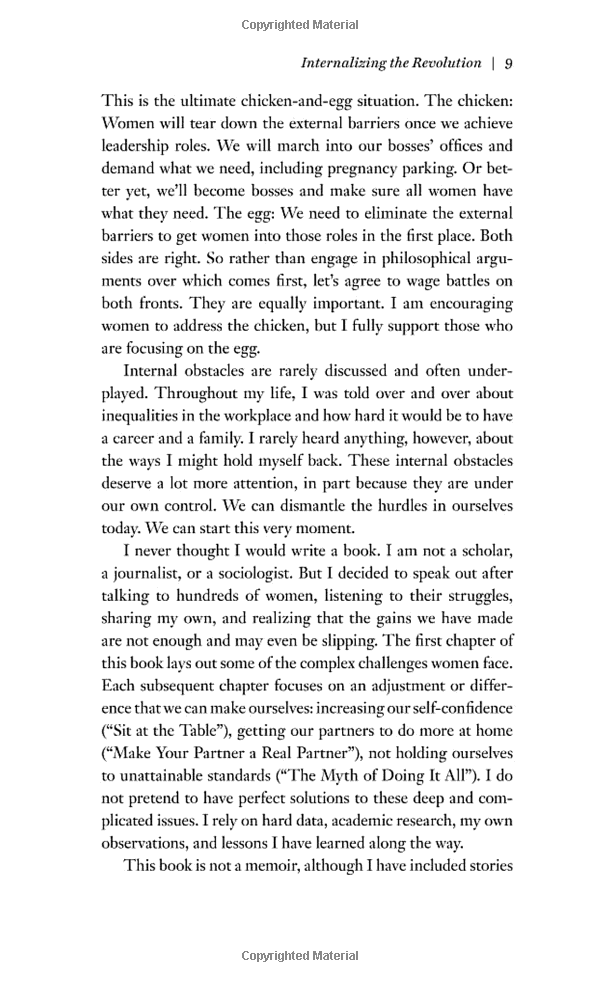 In Lean In, Sandberg digs deeper into these issues, combining personal anecdotes, hard data, and compelling research to cut through the layers of ambiguity and bias surrounding the lives and choices of working women. She recounts her own decisions, mistakes, and daily struggles to make the right choices for herself, her career, and her family. She provides practical advice on negotiation techniques, mentorship, and building a satisfying career, urging women to set boundaries and to abandon the myth of “having it all.”  She describes specific steps women can take to combine professional achievement with personal fulfillment and demonstrates how men can benefit by supporting women in the workplace and at home.