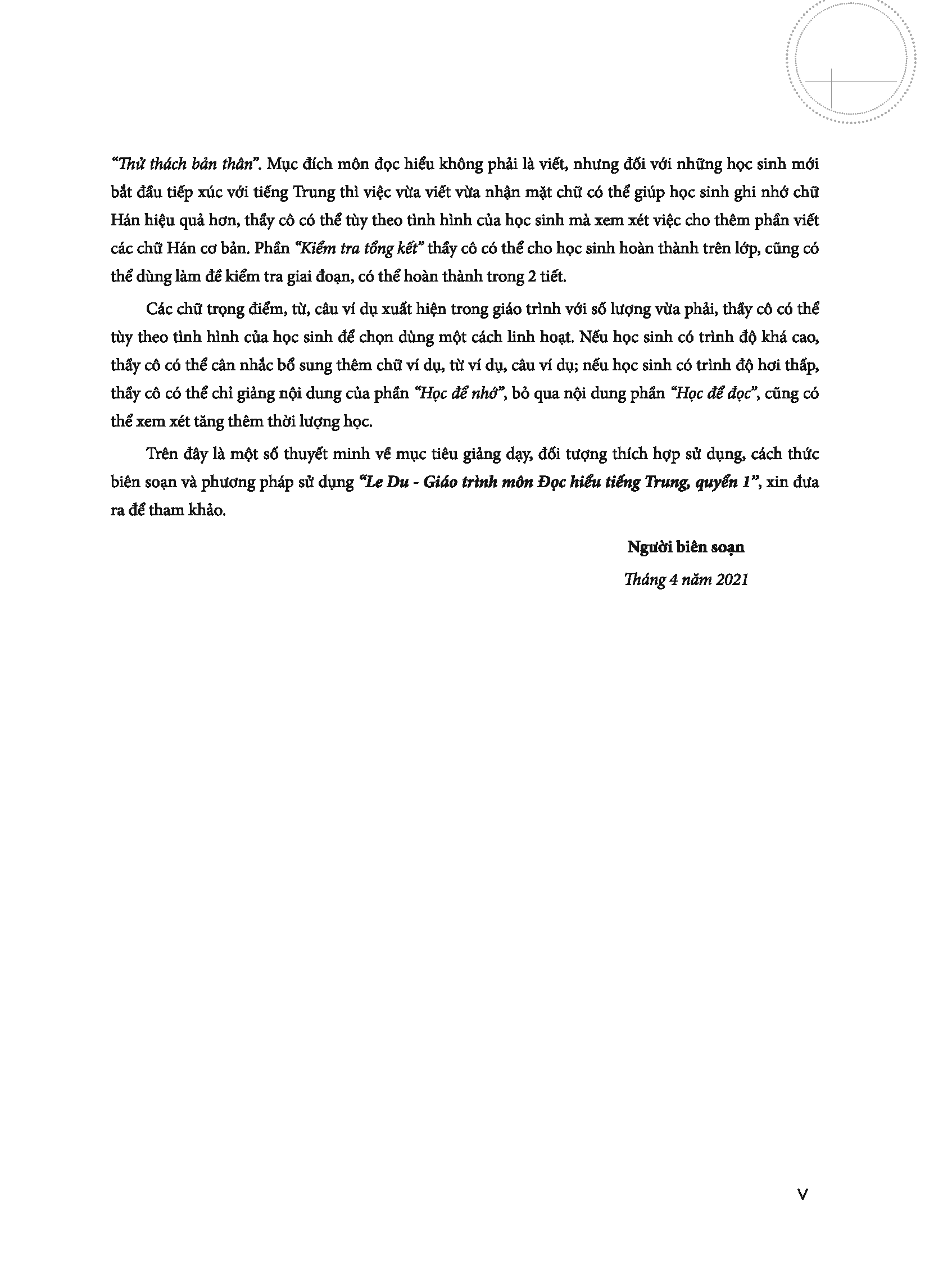Trên đây là một số thuyết minh về mục tiêu giảng dạy, đối tượng thích hợp sử dụng, nội dung thể lệ và phương pháp sử dụng “Le Du - Giáo trình môn Đọc hiểu tiếng Trung, quyển 1”, xin đưa ra để tham khảo.