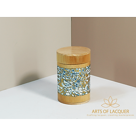 Sản phẩm trong hình là "Lọ Tre Sơn Mài Khảm Trai Xanh Biển" từ Arts of Lacquer. Hộp có thiết kế tròn với nền màu vàng nhạt, được trang trí bằng hoa văn tinh xảo