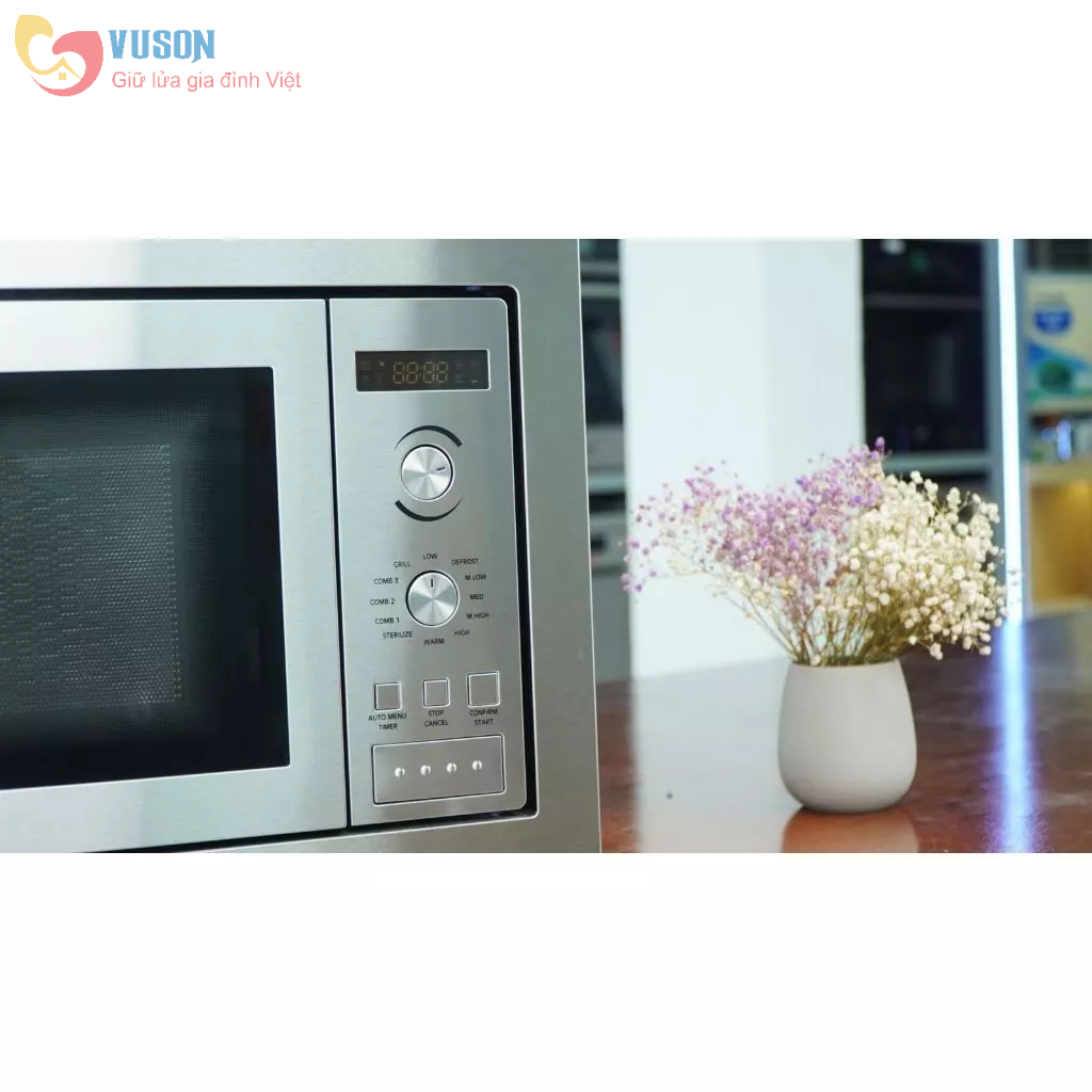 Mô tả sản phẩm • Lò vi sóng âm tủ kết hợp nướng thân inox • Dung tích 25L • Màn hình hiện thị LCD • Hệ thống điều khiển phím bấm điện tử •